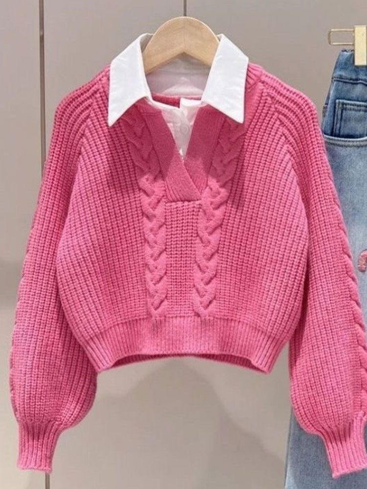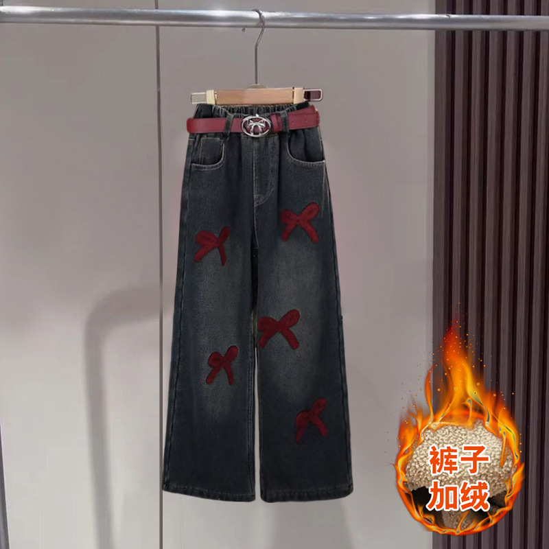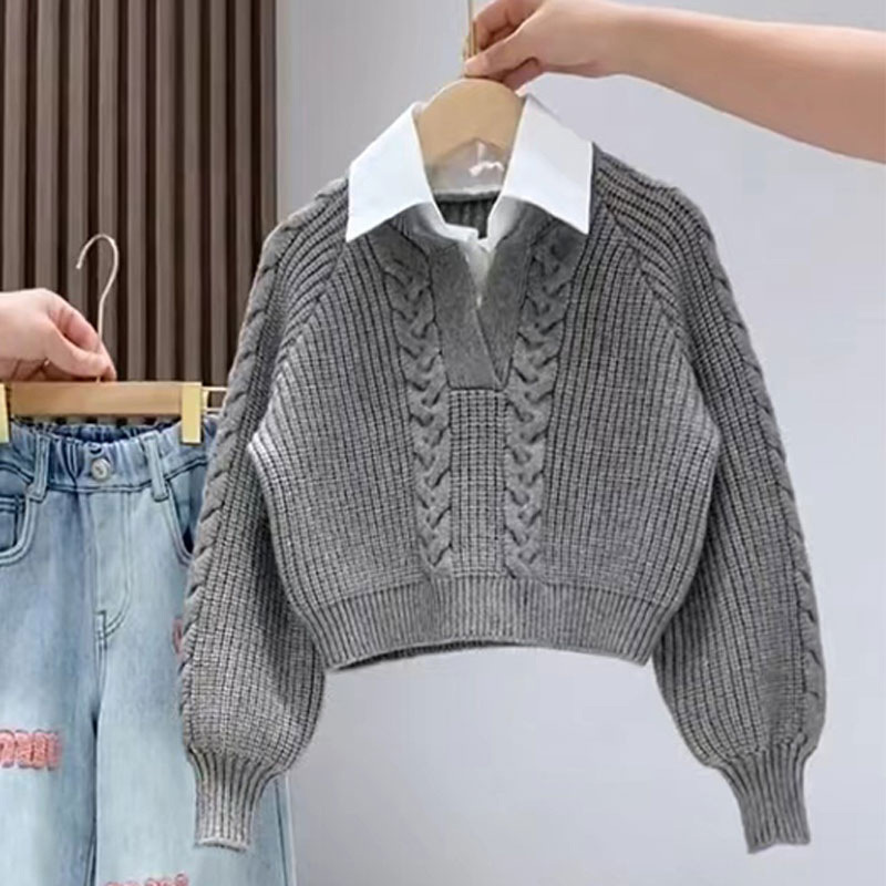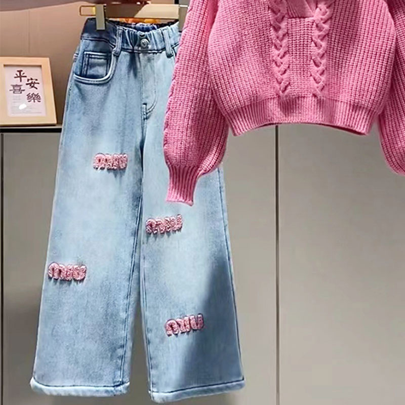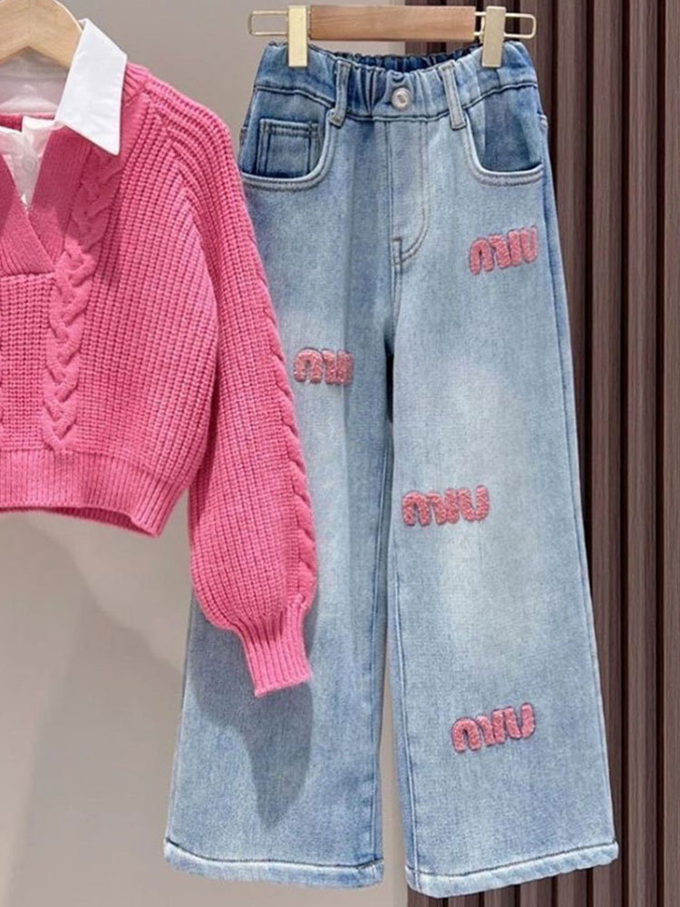 여자 스웨터 세트 가을 겨울 한국 스타일 빅 보이 가짜 투피스 학술 스타일 한국 스타일 스웨터 스트레이트 데님 와이드 레그 바지
