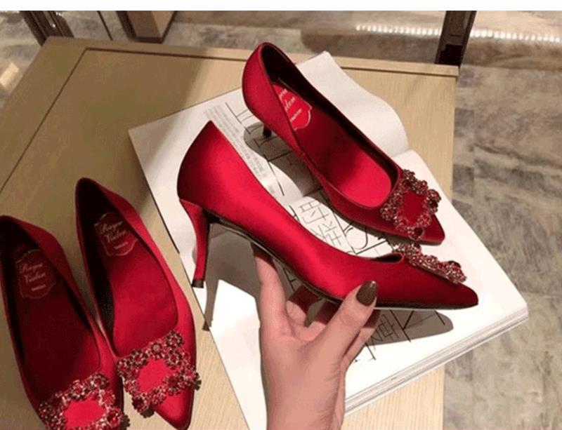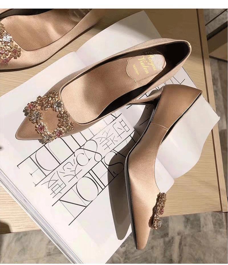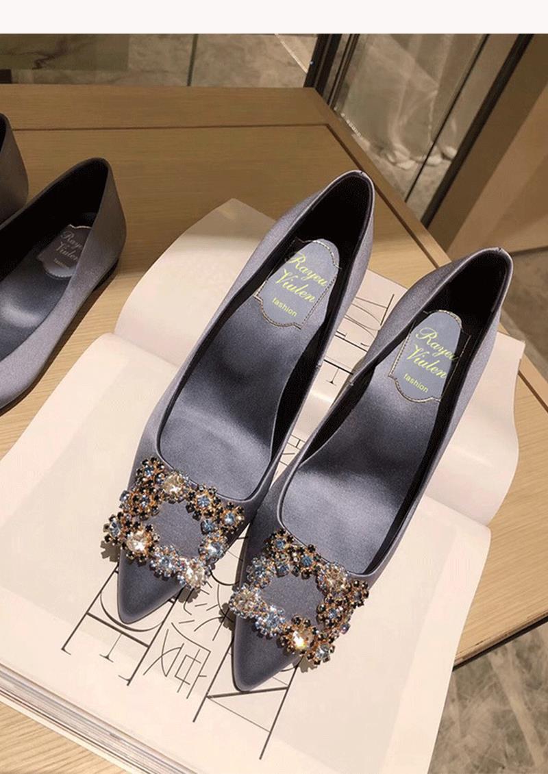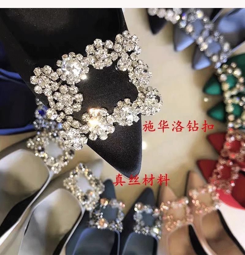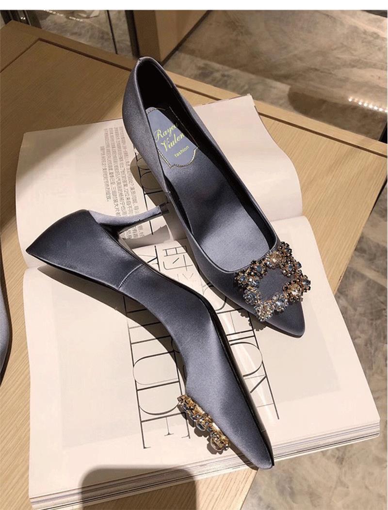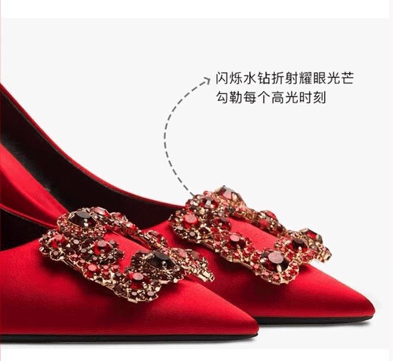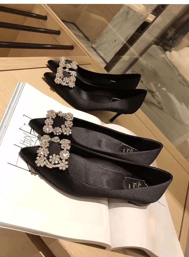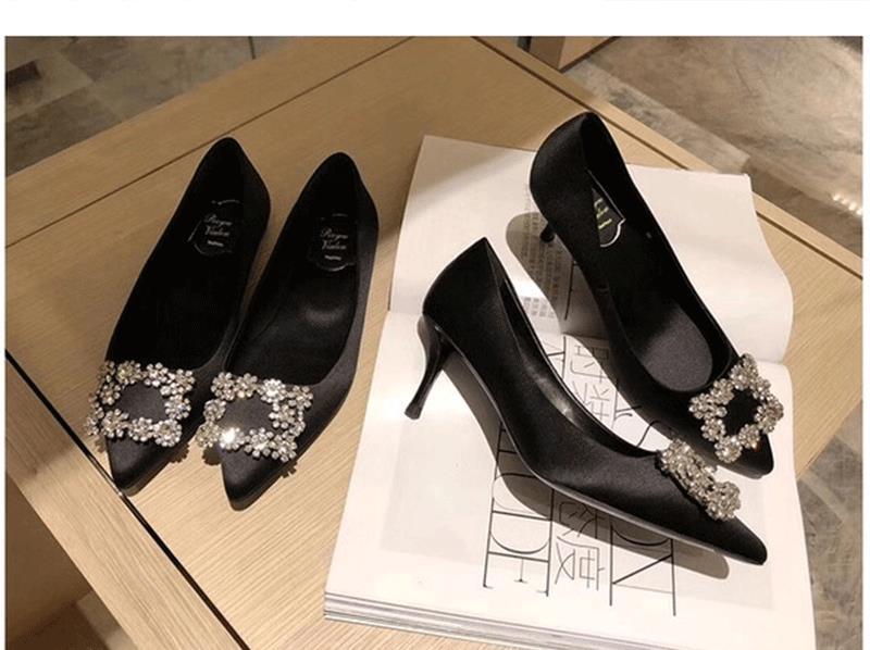 RV 라인 석 지적 발가락 블랙 하이힐 신발 2025 새로운 새틴 스틸레토 웨딩 신발 쇼 나무 정장 신부 신발 스퀘어 버클 싱글 신발스토어 가기