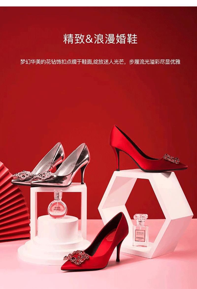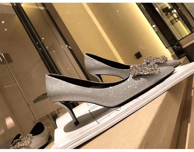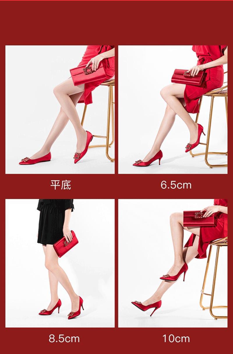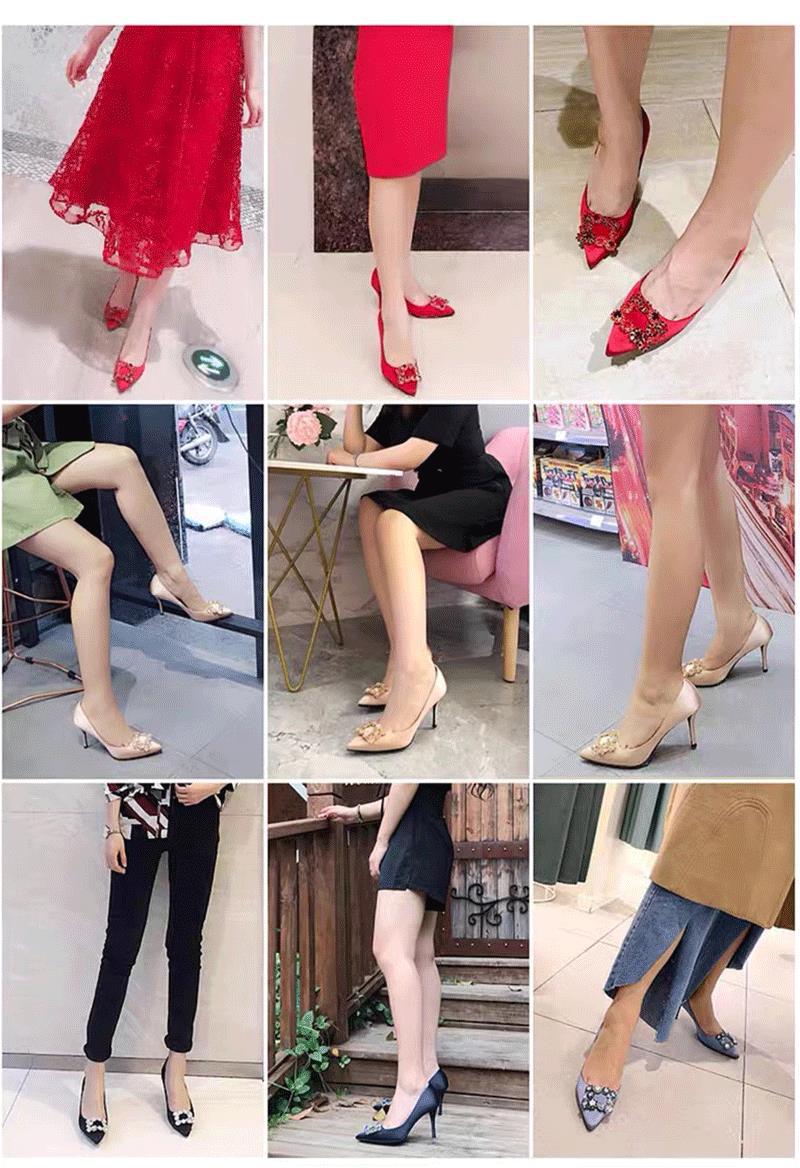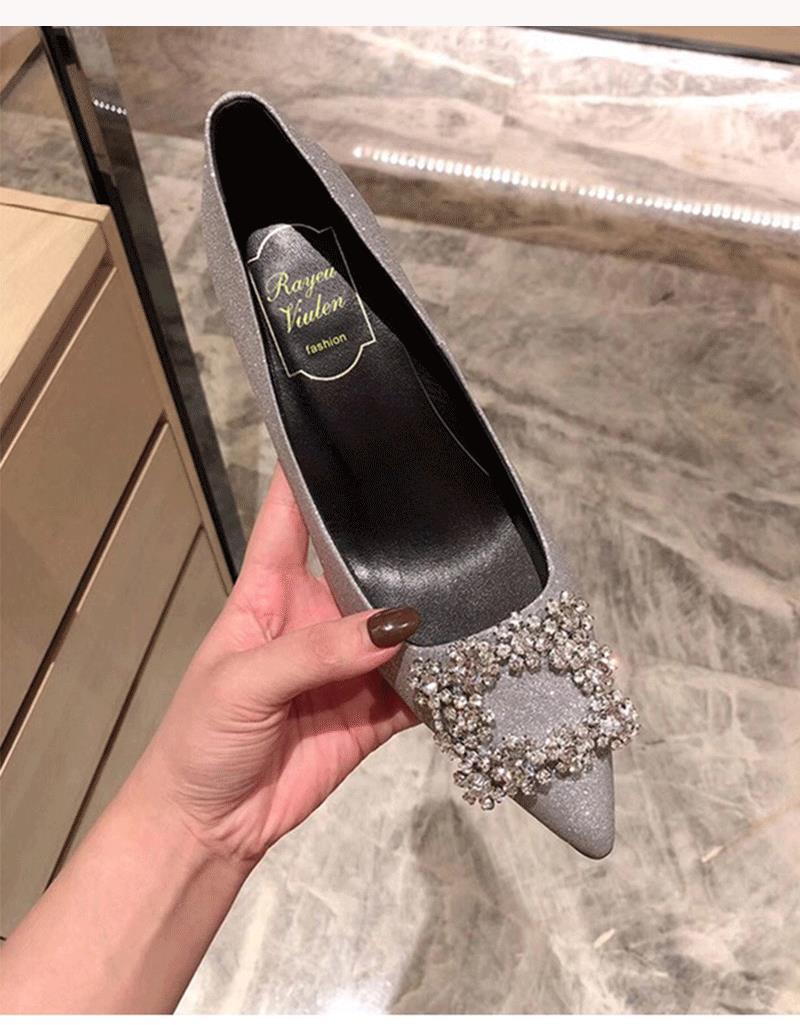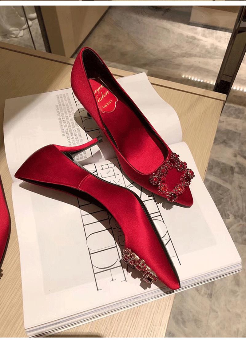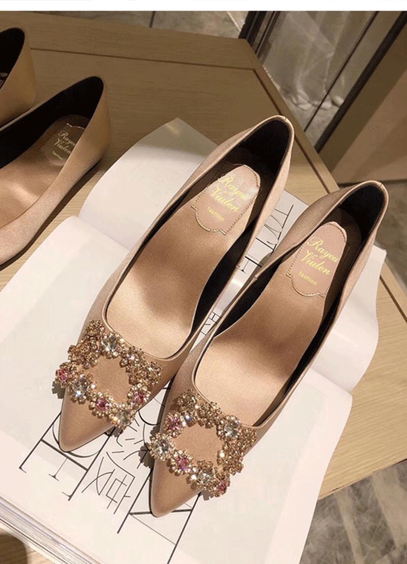 RV 라인 석 지적 발가락 블랙 하이힐 신발 2025 새로운 새틴 스틸레토 웨딩 신발 쇼 나무 정장 신부 신발 스퀘어 버클 싱글 신발스토어 가기