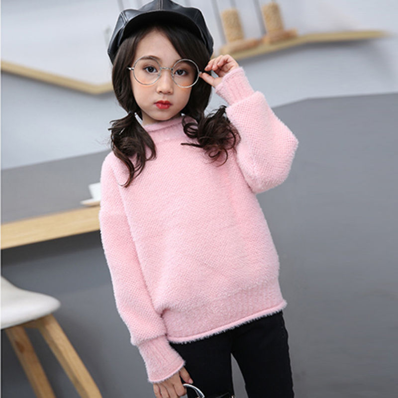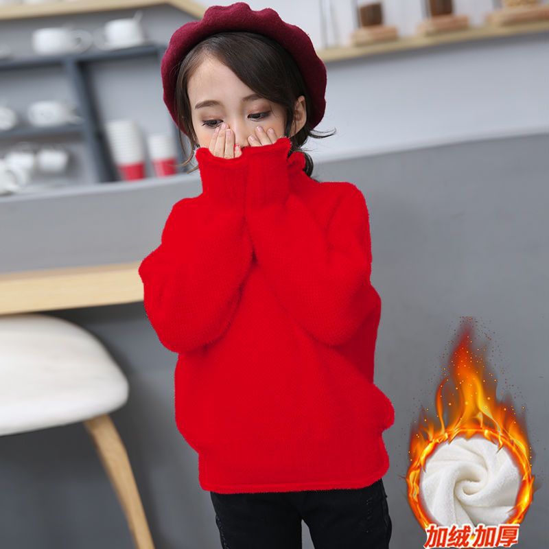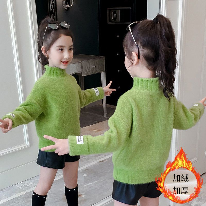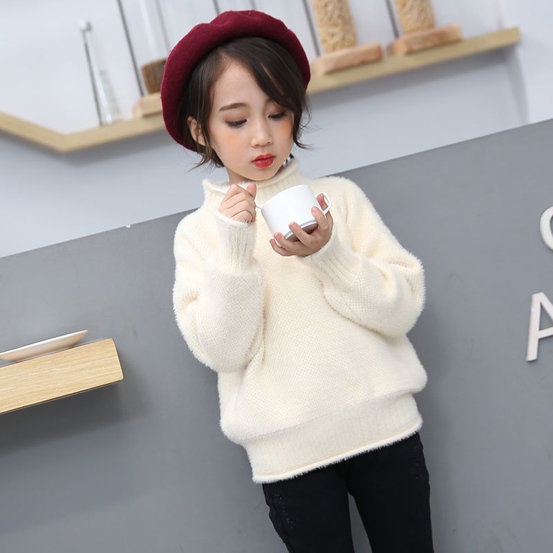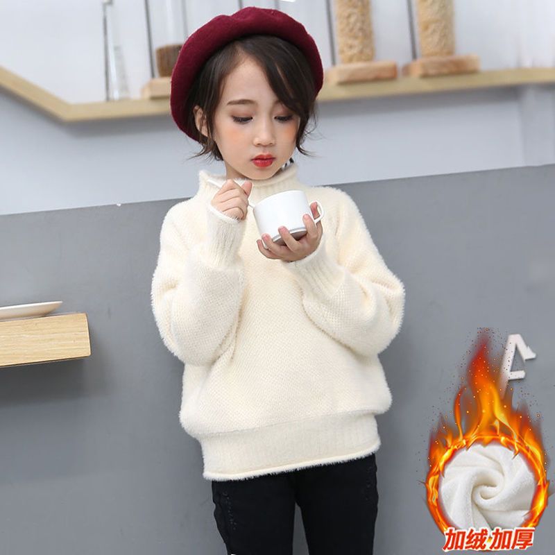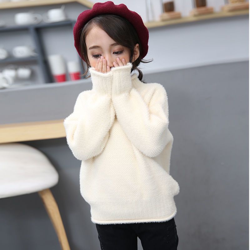 2023 새로운 걸스 밍크 벨벳 어린이 스웨터 한국 니트 기모 두꺼운 베이스 셔츠 화이트 터틀넥 스웨터