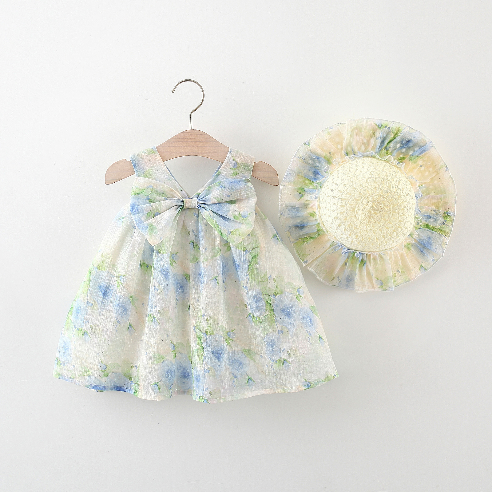 여름 새로운 아동복 도매 소녀 한국 쉬폰 인쇄 밀짚 모자 원피스 머리카락 세대스토어 가기