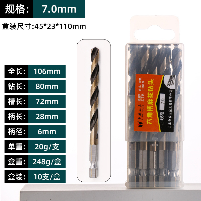 • 7.0mm 육각 생크 트위스트 드릴 비트, 상자당 10개, 상자당 248g