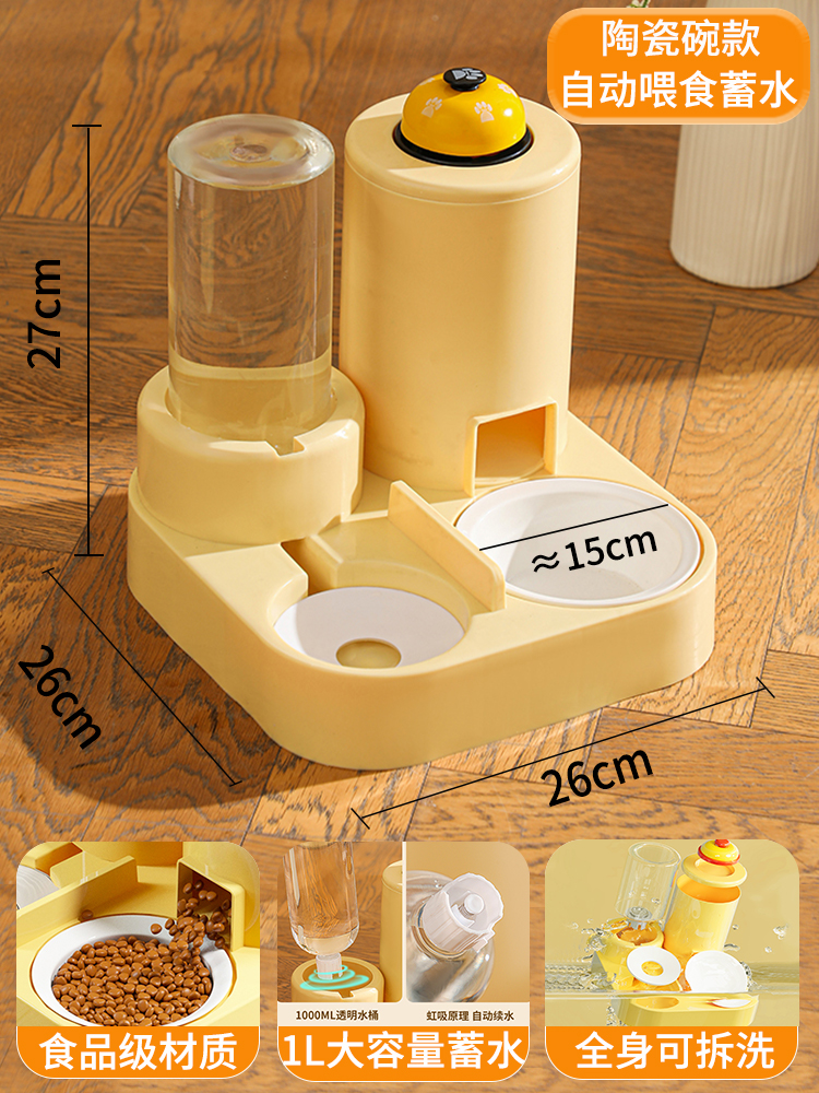 • 세라믹 그릇 자동 급식기 - 크림색 노란색 벨 포함 [자동 물 저장 및 먹이 공급]