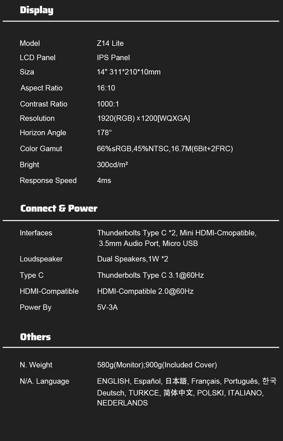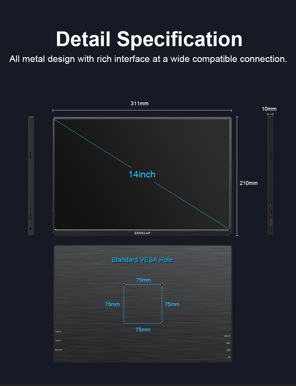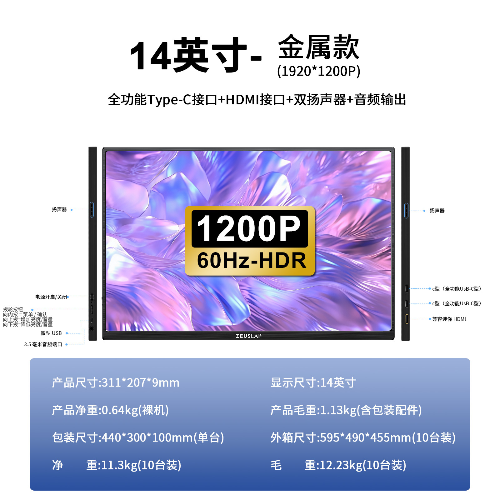 ZEUSLAP Zeus Z14 Lite 14 인치 휴대용 디스플레이 1920*1200 컴퓨터 디스플레이 비 터치스토어 가기