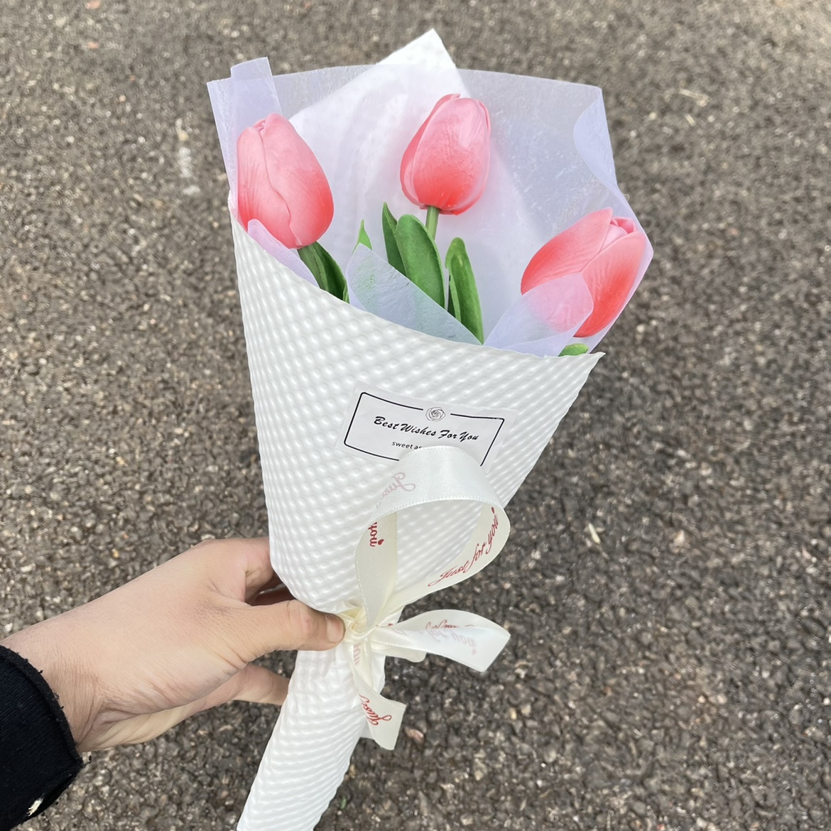 • 양각된 세 개의 밝은 분홍색 튤립