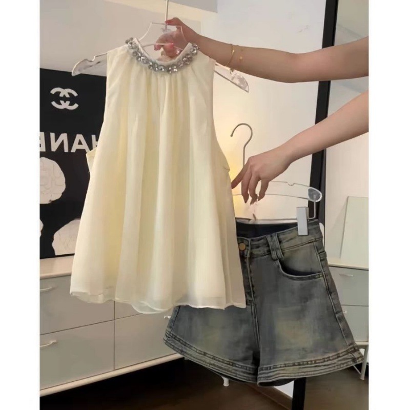 새로운 쉬폰 셔츠 중공업 민소매 조끼 여성 여름 프랑스 스타일 우아한 슬림핏 섹시한 어깨 스트랩 탑스토어 가기