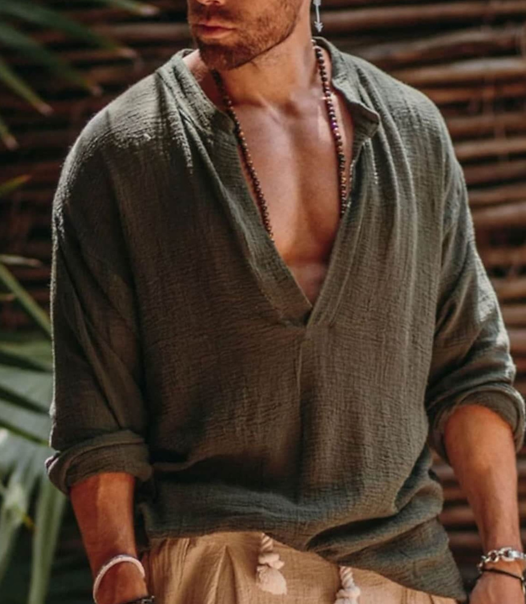 남성용 독립형 리넨 셔츠 바이킹 스타일 여름 비치 착용 긴팔 솔리드 컬러 V 넥 야외 스트리트 얇은