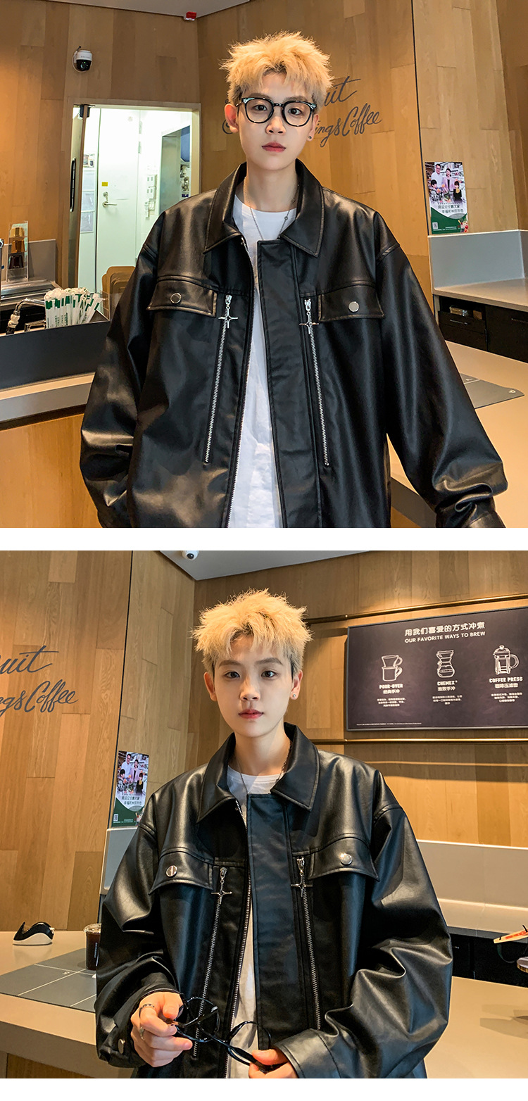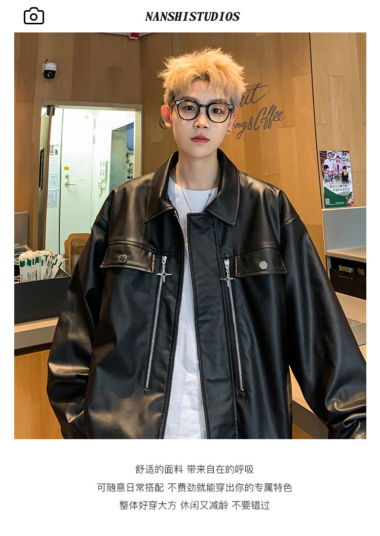 가죽 자켓 남자 2024 년 새로운 봄과 가을 Pushuai 튀긴 거리 느슨한 조수 브랜드 미국 하이 스트리트 오토바이 pu 가죽 자켓