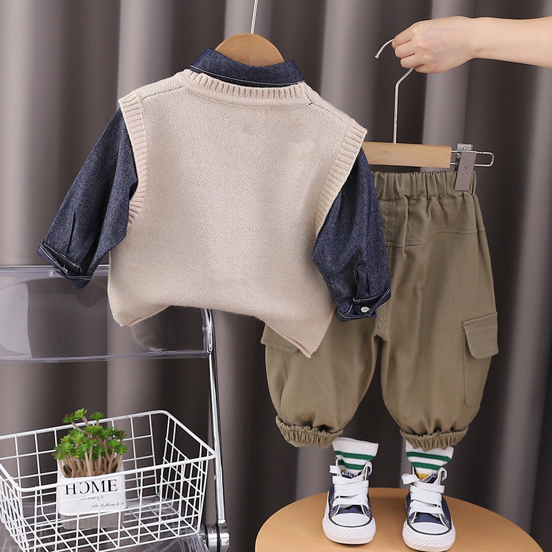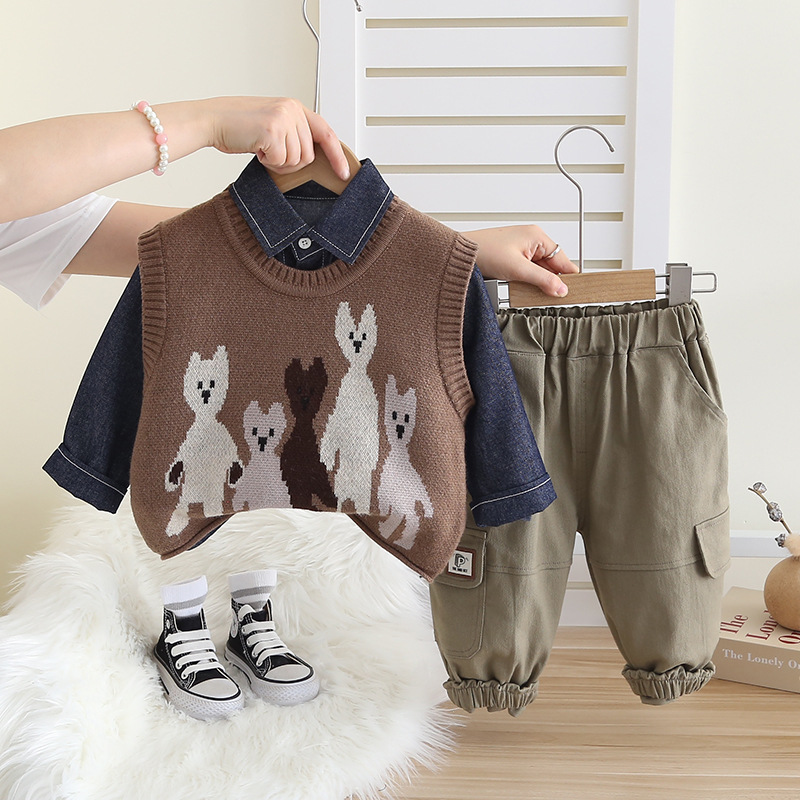 소년 만화 캐주얼 니트 스웨터 조끼 가을 3 피스 세트 2024 새로운 어린이 서양식 한국 스타일 세트 패션스토어 가기