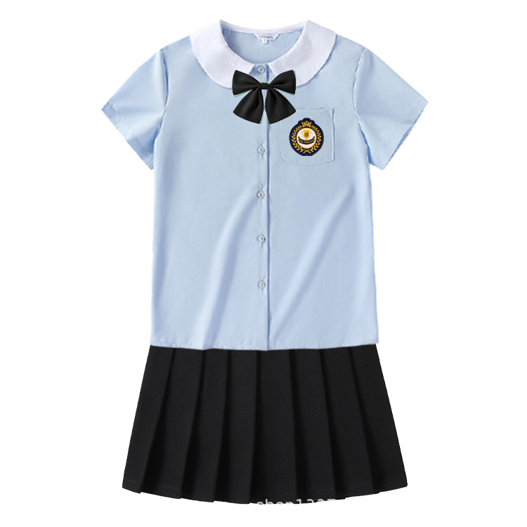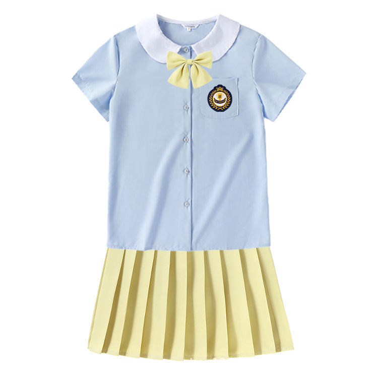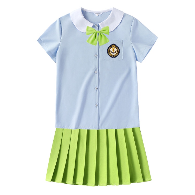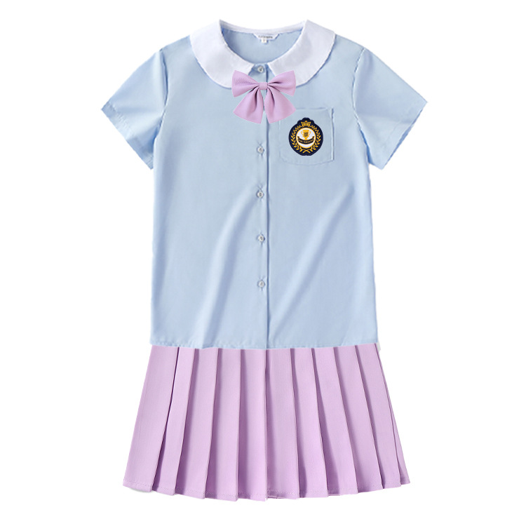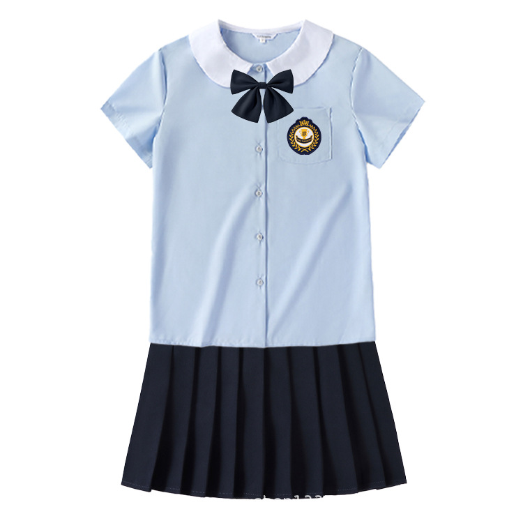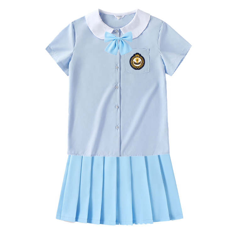 싱글 셔츠 시리즈 블루 라운드 넥 짧은 소매 싱글 원피스 단색 스커트 대학 스타일