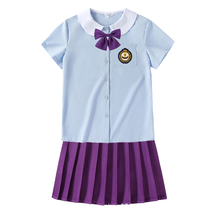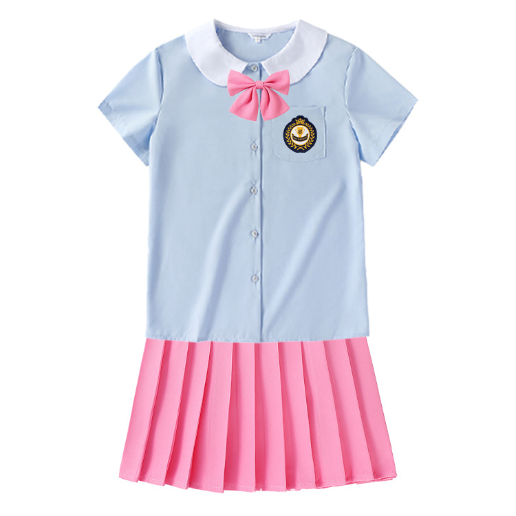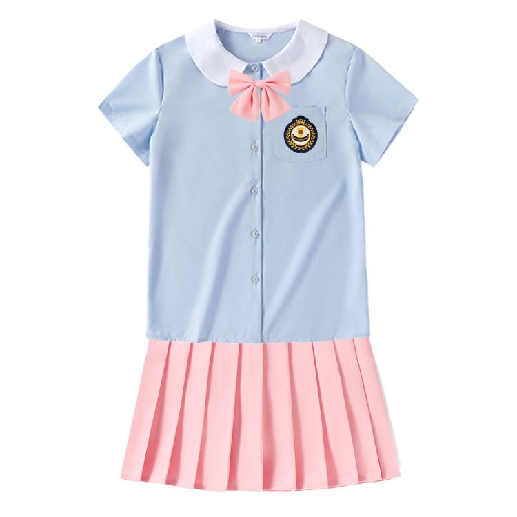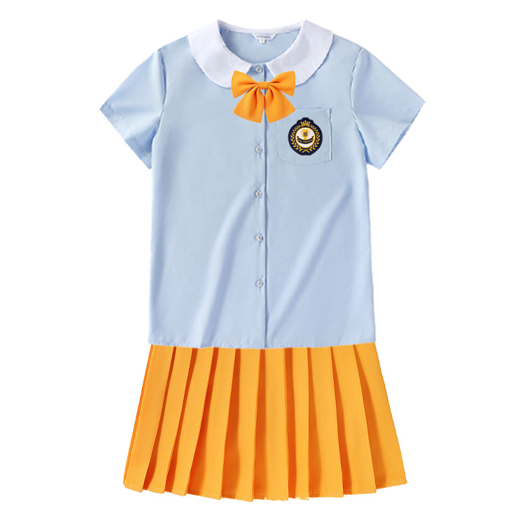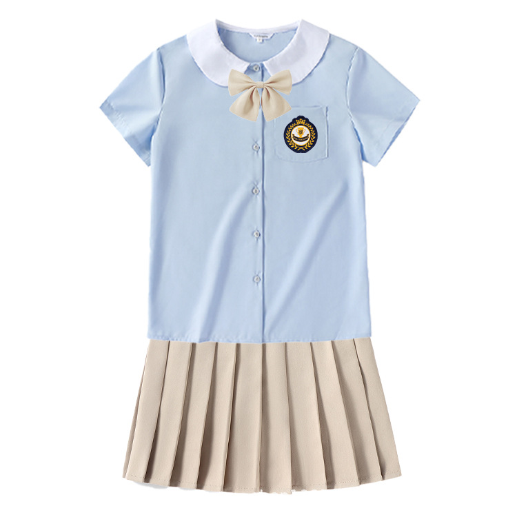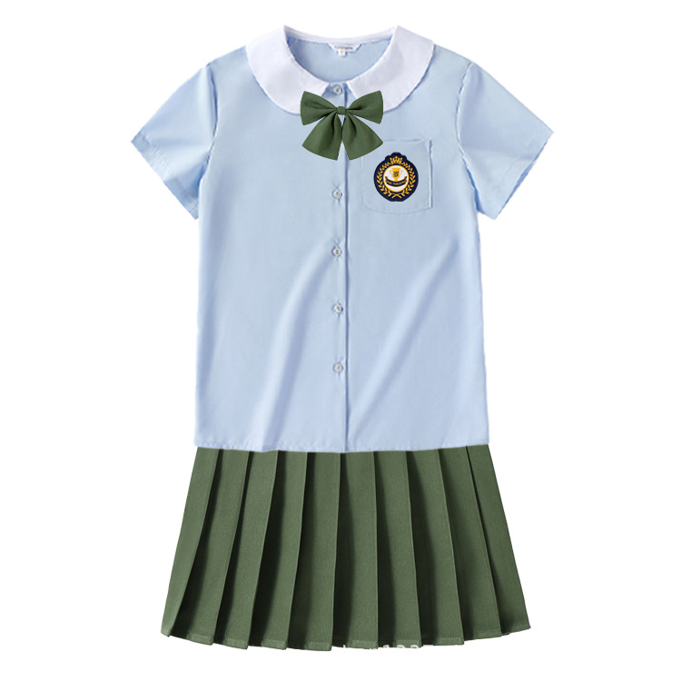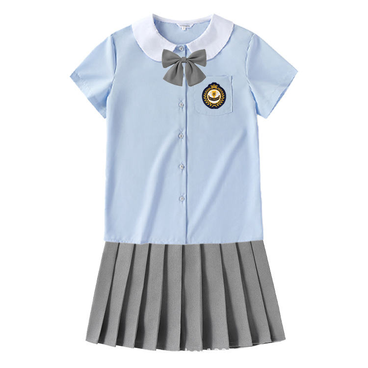 싱글 셔츠 시리즈 블루 라운드 넥 짧은 소매 싱글 원피스 단색 스커트 대학 스타일
