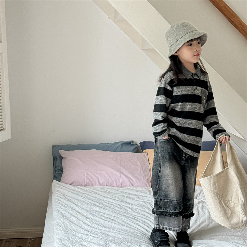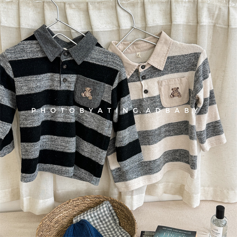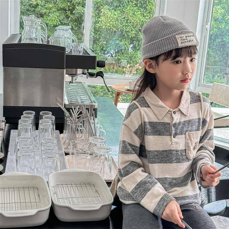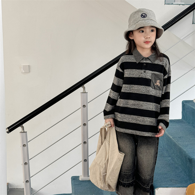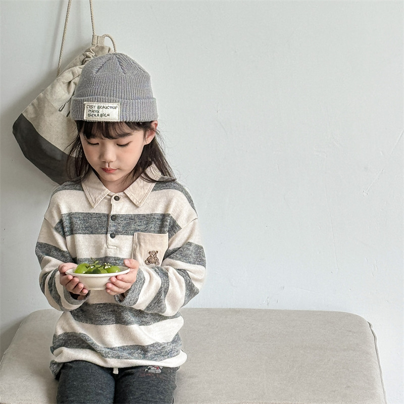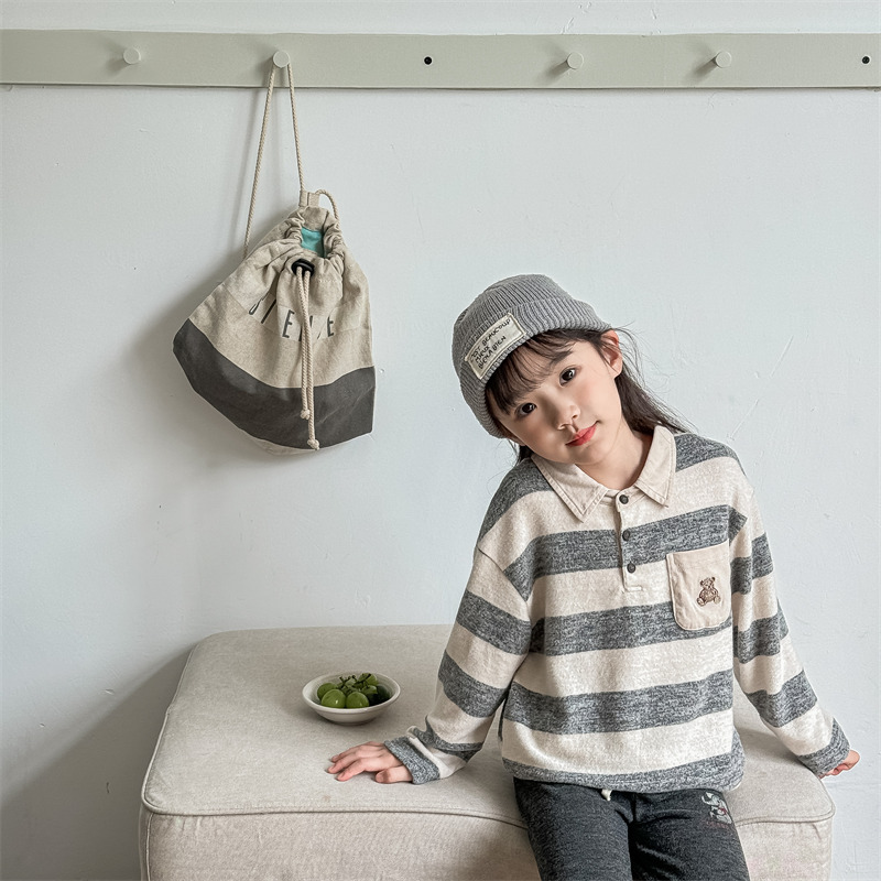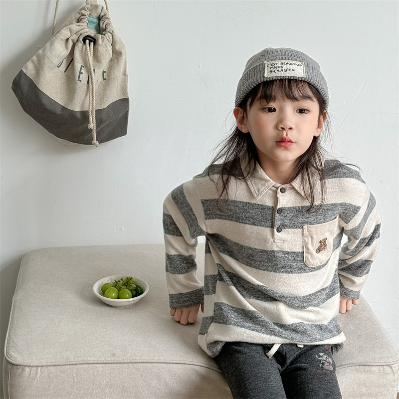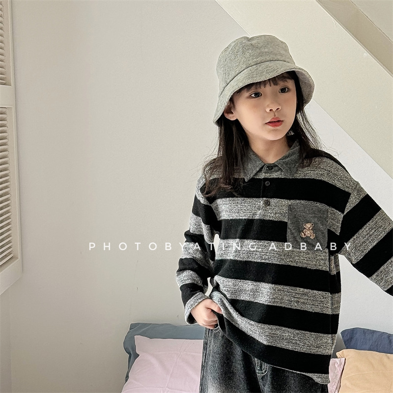 어린이 긴 소매 티셔츠 2024 가을 한국 스타일 새로운 소년과 소녀 스타일 줄무늬 폴로 셔츠 아기베이스 셔츠 트렌디스토어 가기