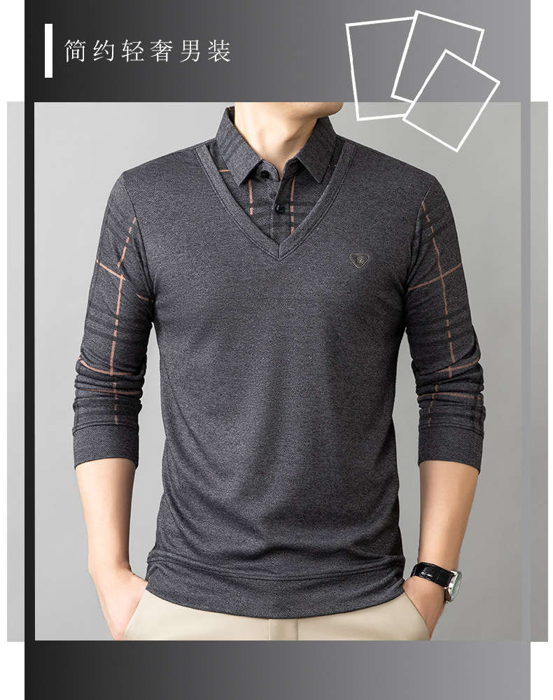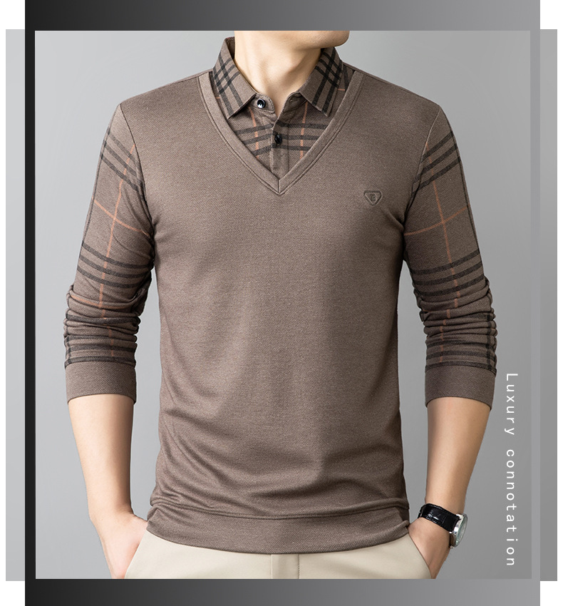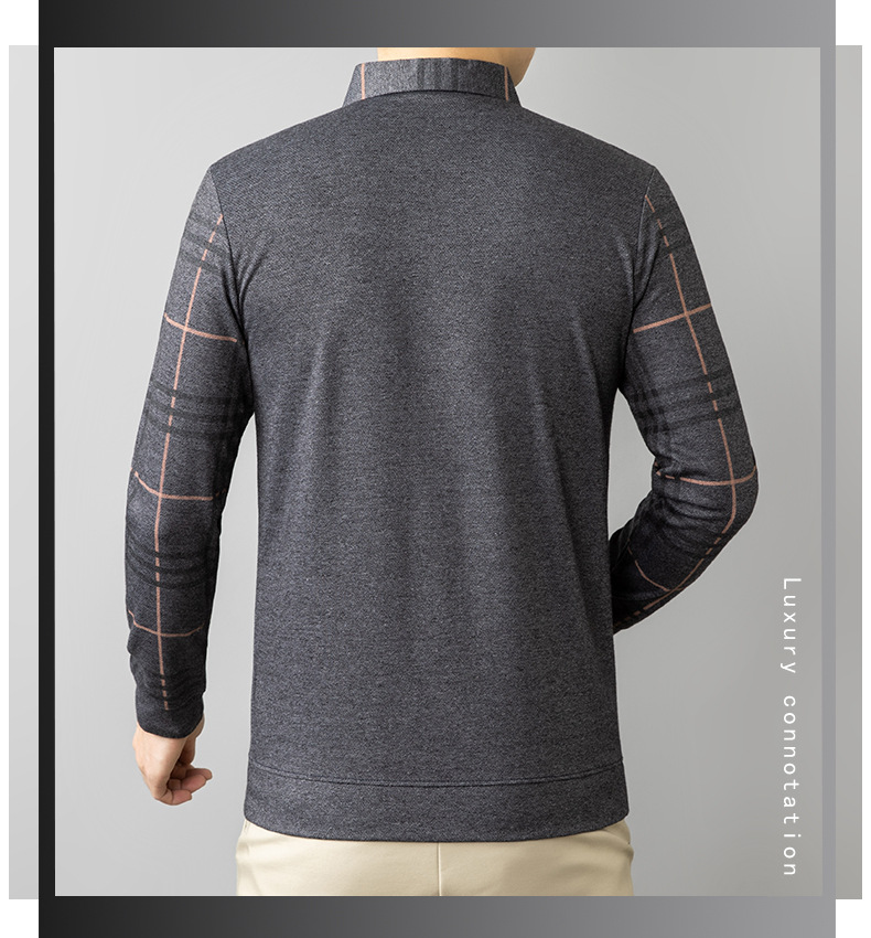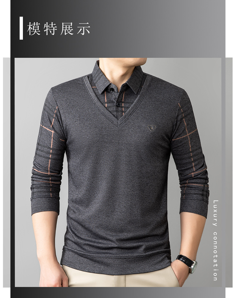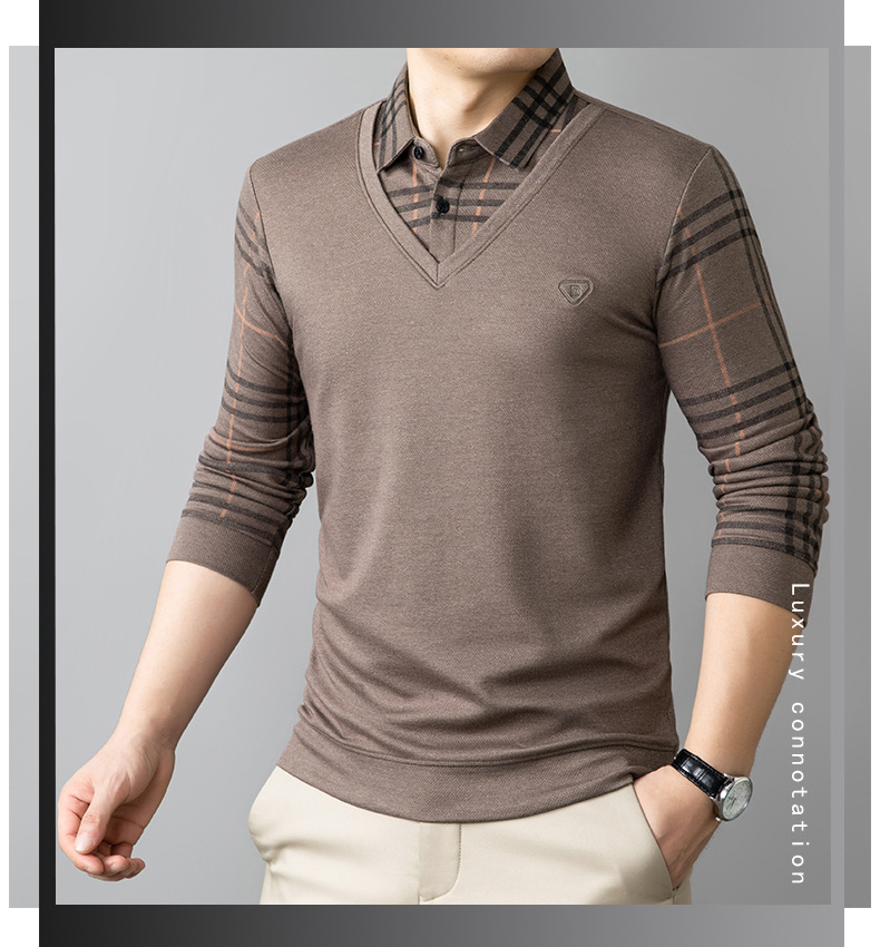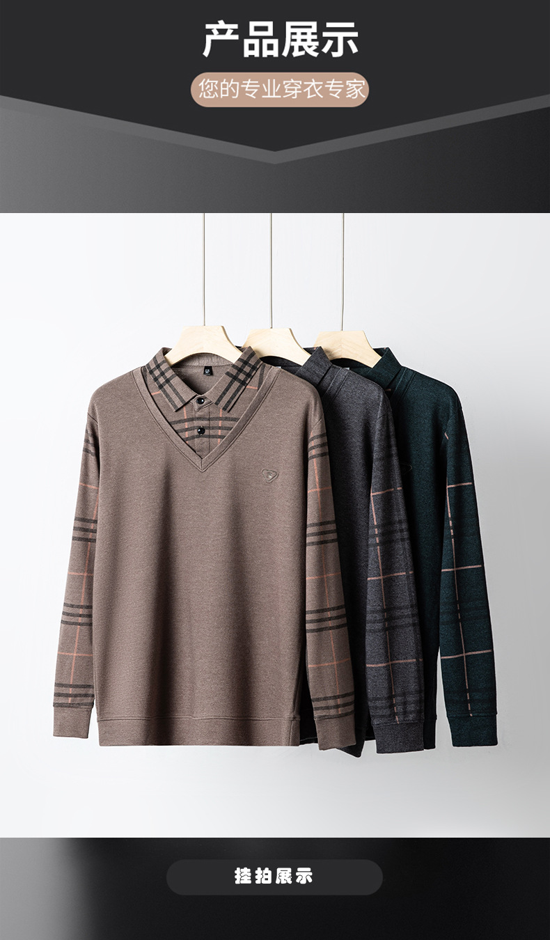 2024 년 가을 새로운 가짜 투피스 긴팔 티셔츠 남성용 중년 캐주얼 루즈 라 격자 아빠베이스 셔츠