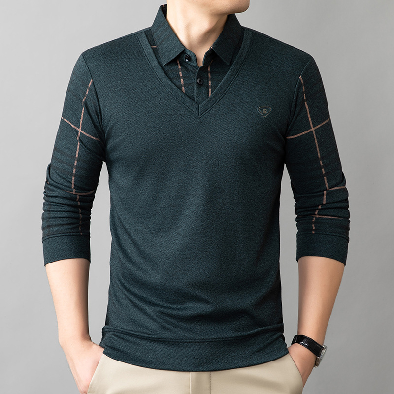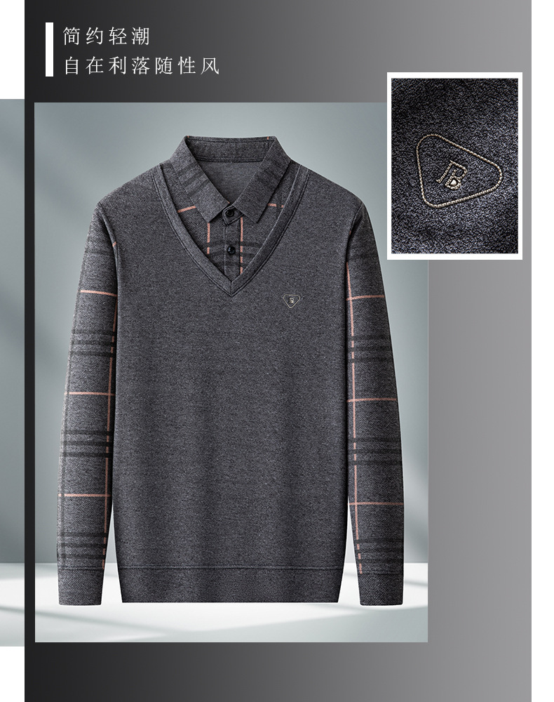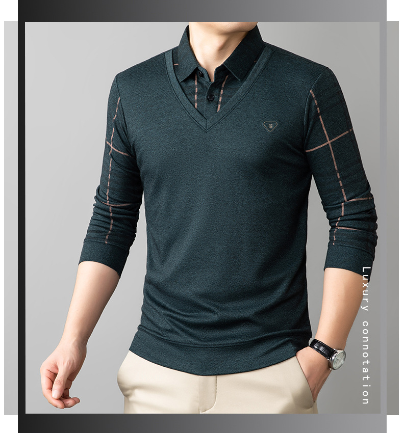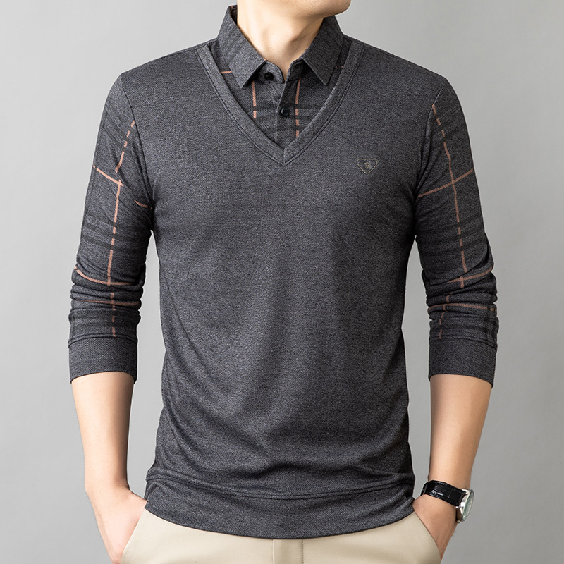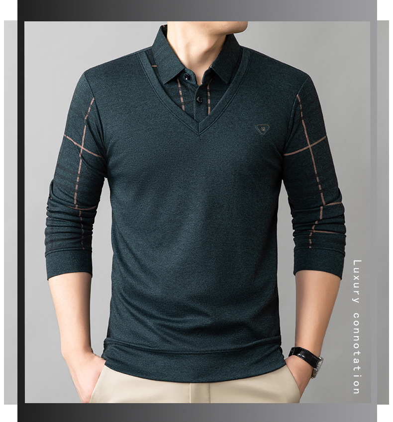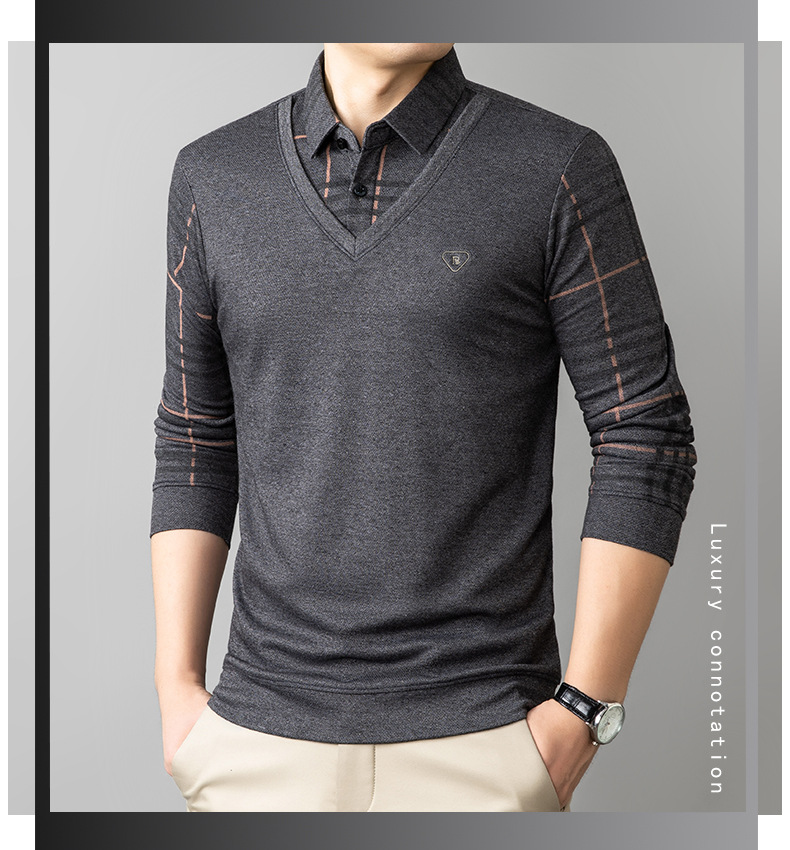2024 년 가을 새로운 가짜 투피스 긴팔 티셔츠 남성용 중년 캐주얼 루즈 라 격자 아빠베이스 셔츠