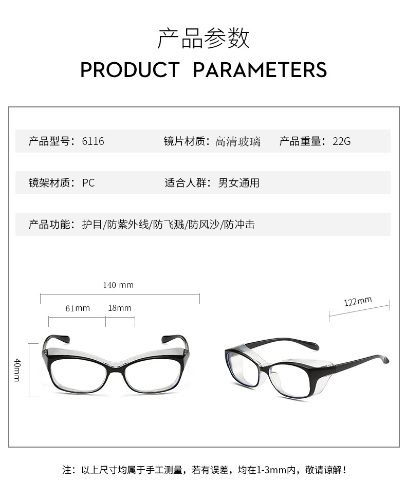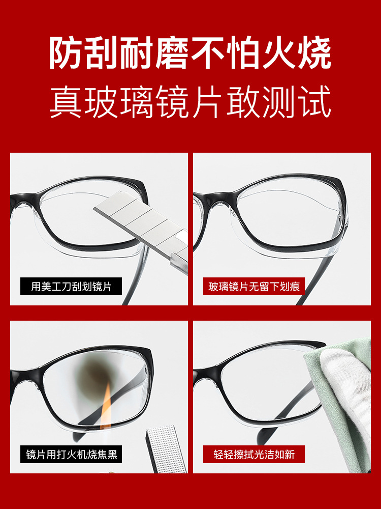 • 투명 프레임 유리 렌즈에는 거울 상자와 렌즈 천이 함께 제공됩니다.