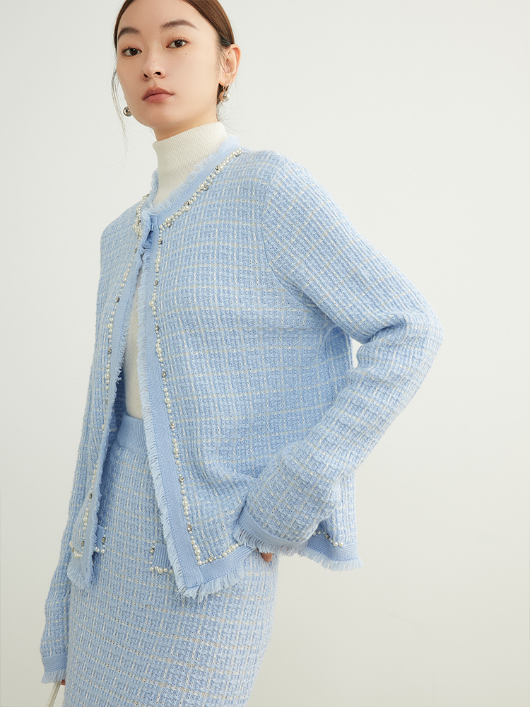 고급스러운 심플하고 세련된 샤넬 스타일 여성용 투피스 스커트 세트, 26일 초봄 럭셔리 워터다이아몬드 울 투피스 가디건 세트스토어 가기
