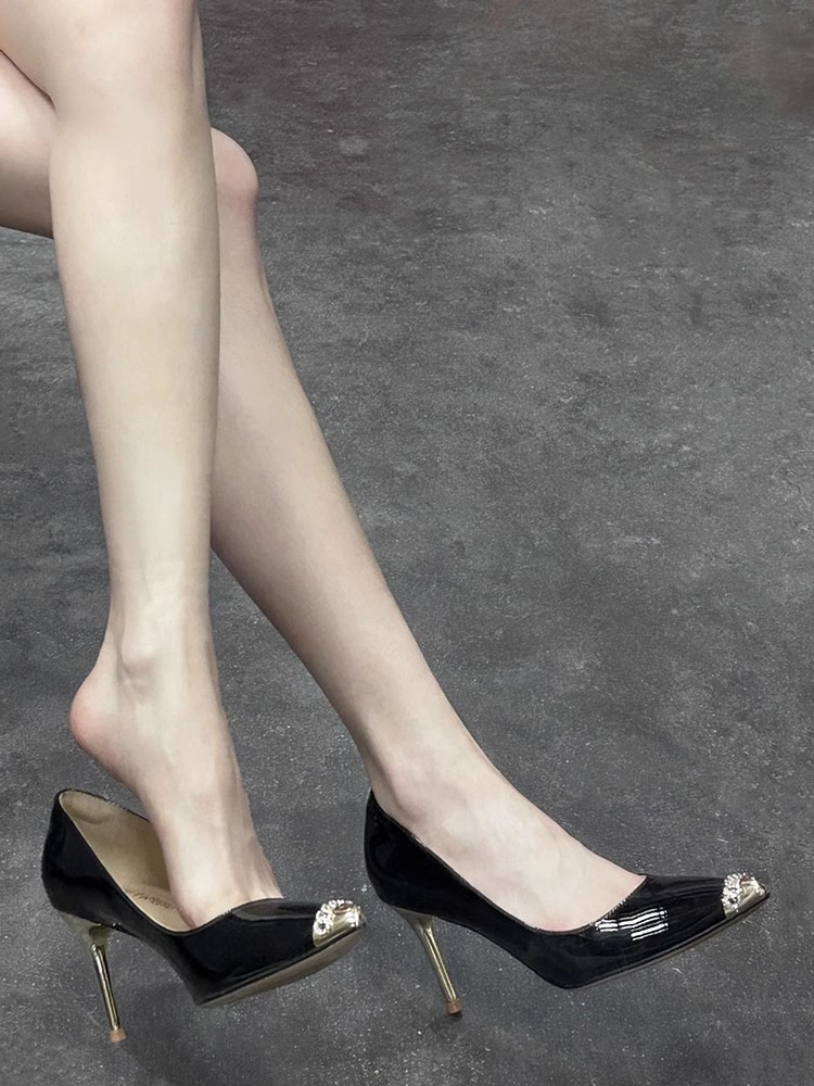 유럽과 미국 스타일의 스파이스 소녀 포인팅 메탈 스틸레토 힐 여성 섹시한 올매치 얕은 특허 가죽 침대 신발 가을 여성