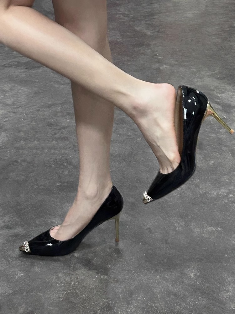유럽과 미국 스타일의 스파이스 소녀 포인팅 메탈 스틸레토 힐 여성 섹시한 올매치 얕은 특허 가죽 침대 신발 가을 여성스토어 가기