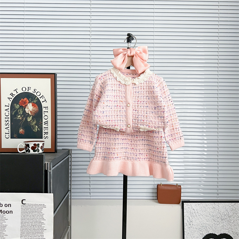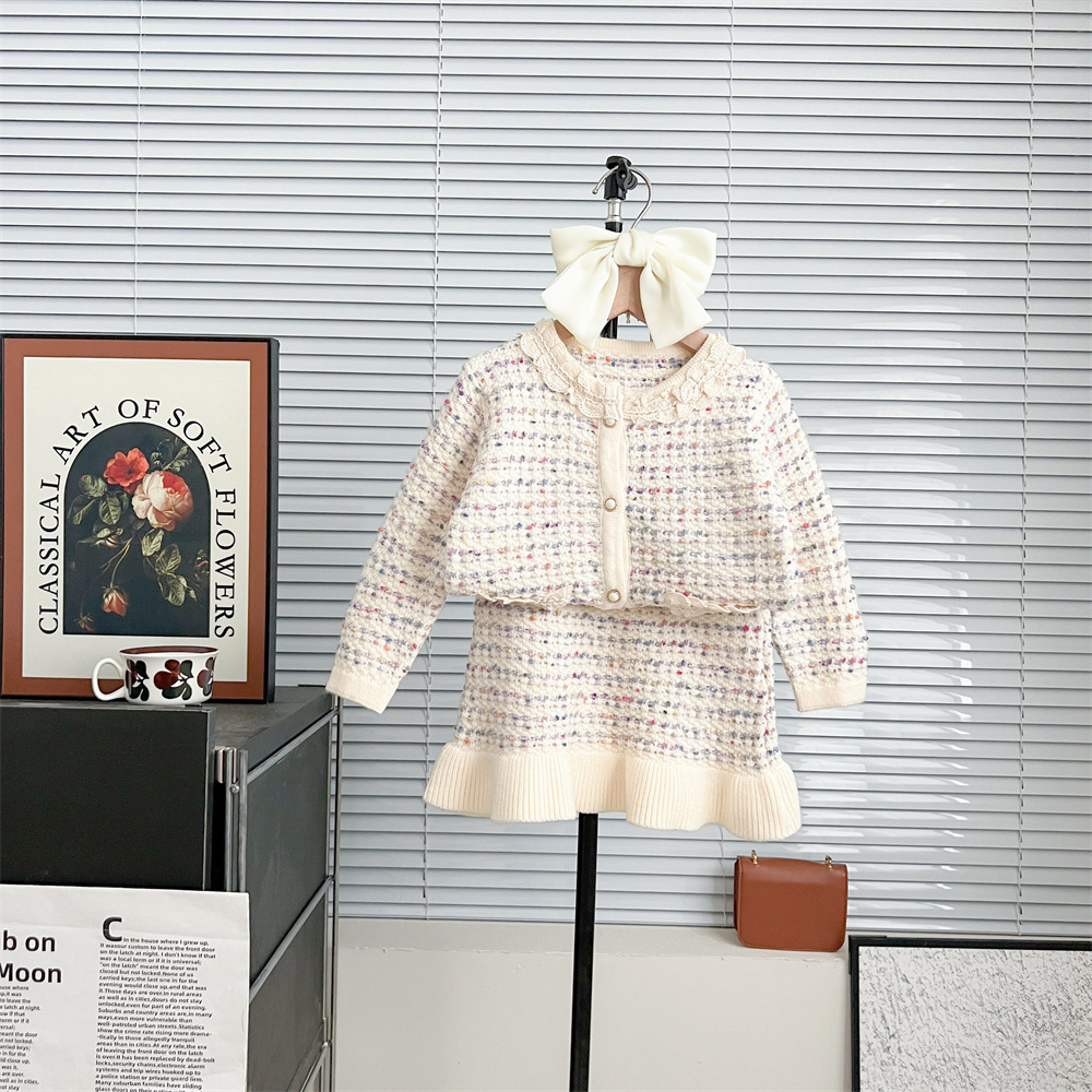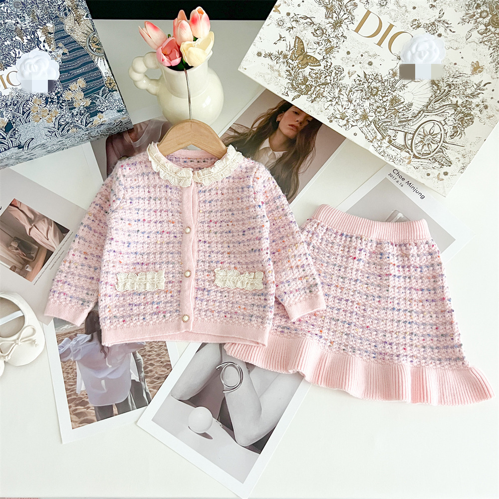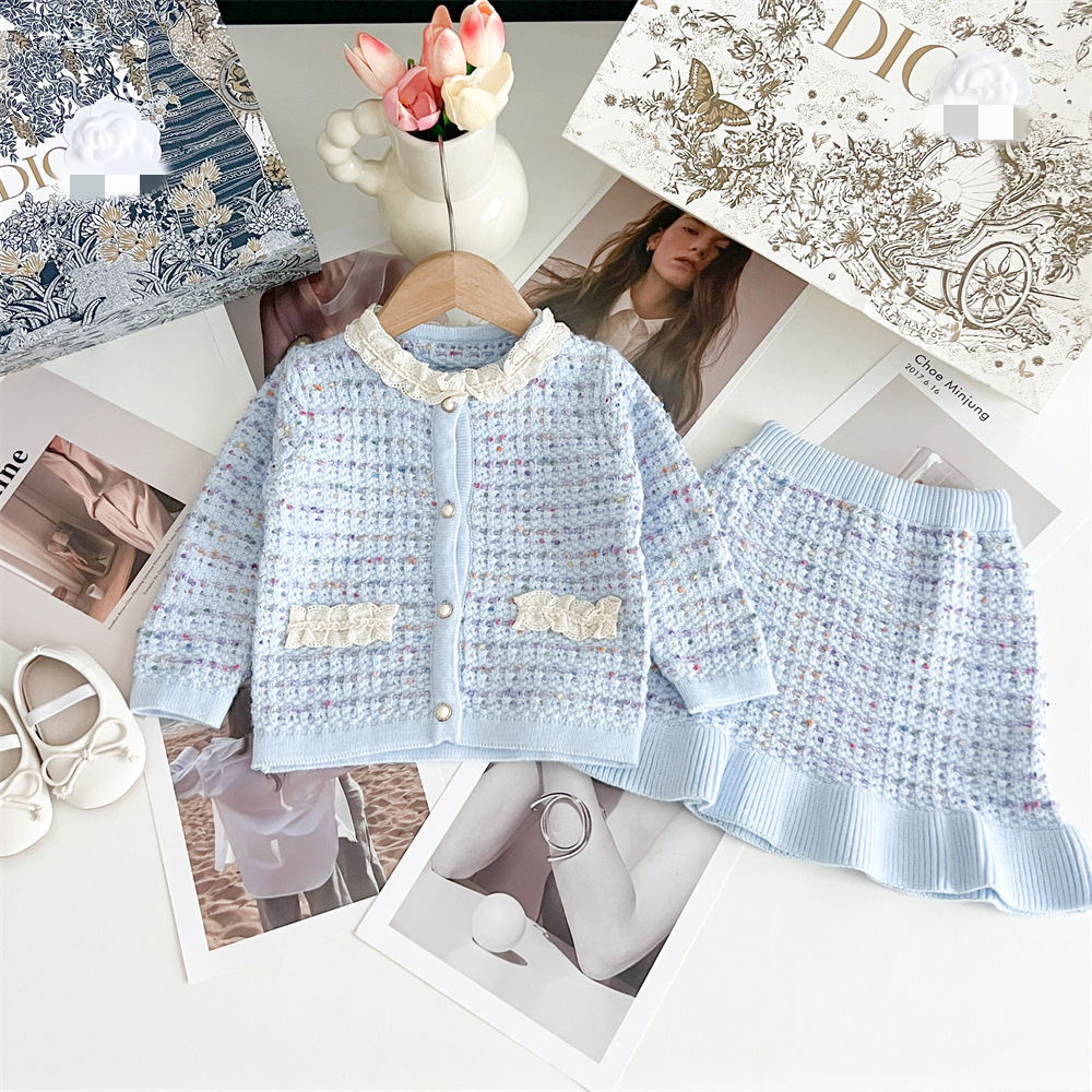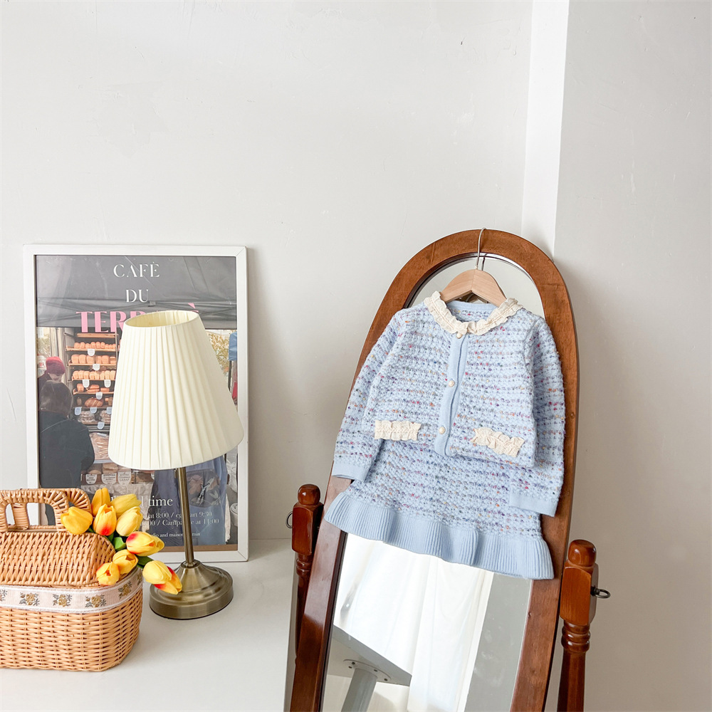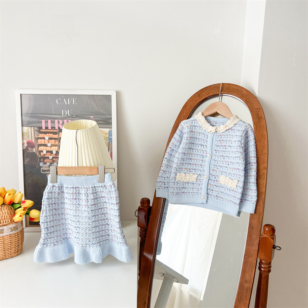2024 가을과 겨울 새 소녀 스웨터 피쉬 테일 스커트 투피스 레이스 니트 스커트 세트 카디건 스커트