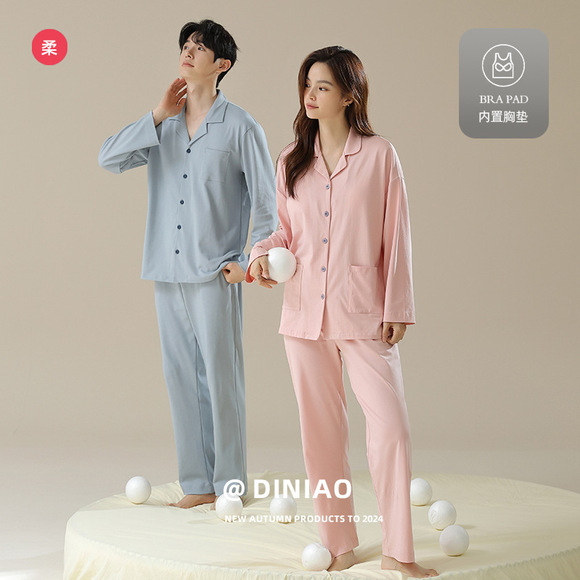 带胸垫秋季情侣睡衣纯棉长袖春季女式家居服男士套装纯欲风高级感
