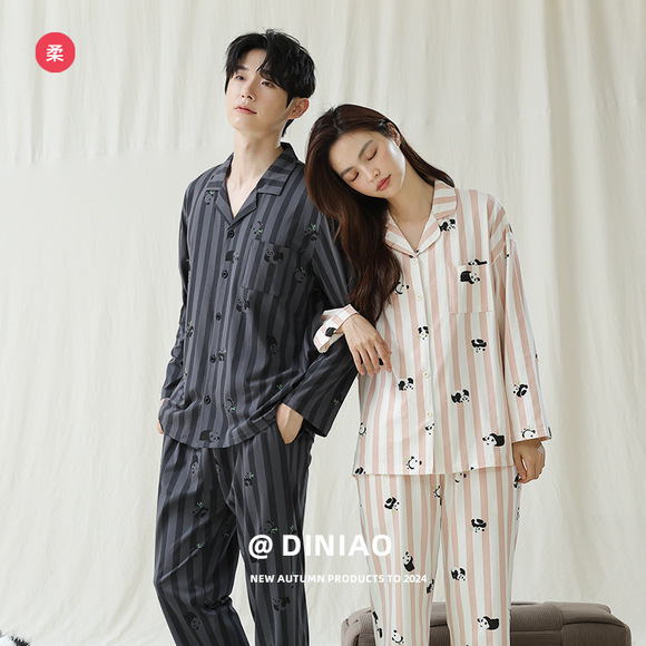 【A类抗菌】春秋季情侣家居服条纹熊猫纯棉女士睡衣翻领男士套装