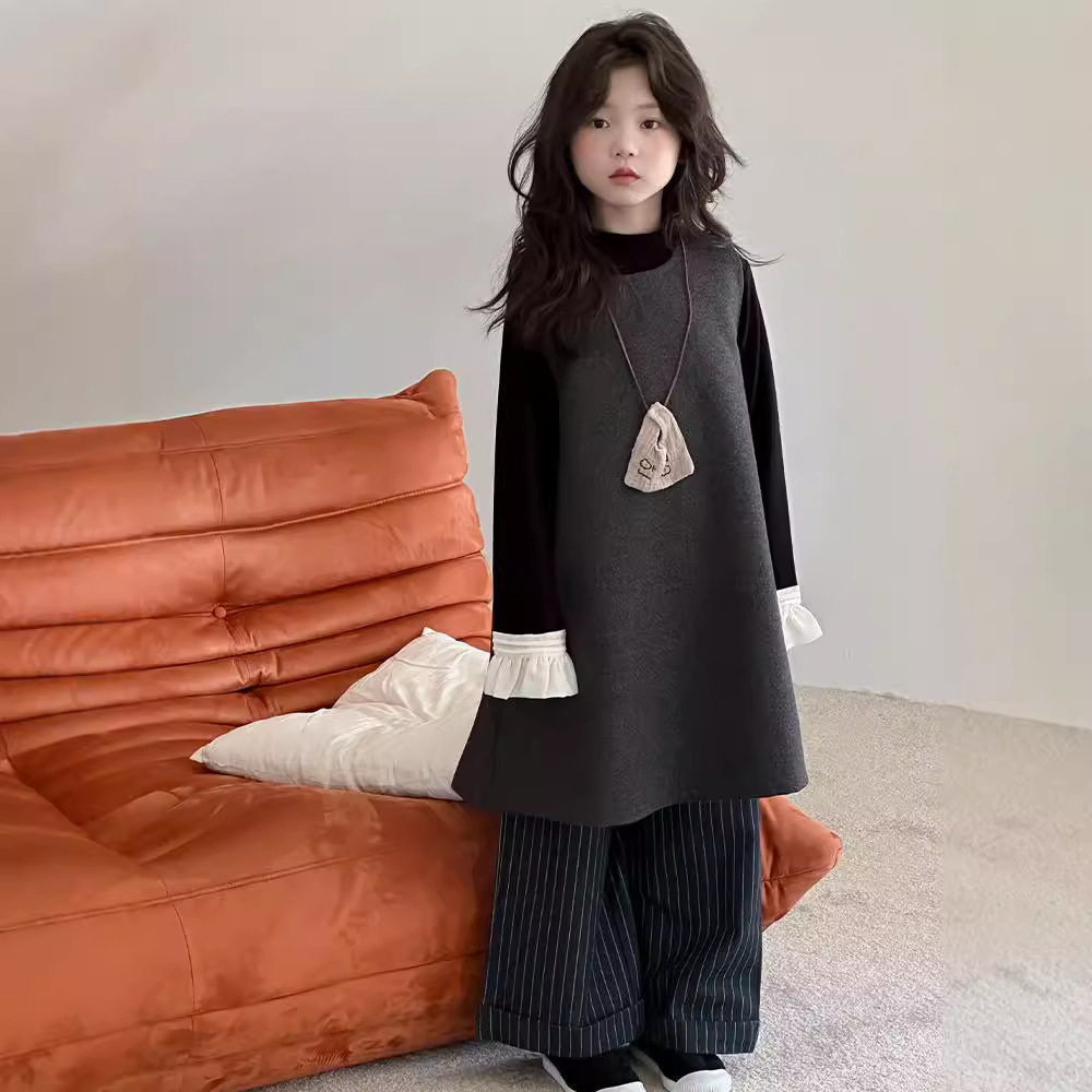소녀 원피스 봄 가을 원피스 큰 어린이 소녀 유행 서양식 한국 스타일 쿨 고급 회색 조끼 원피스