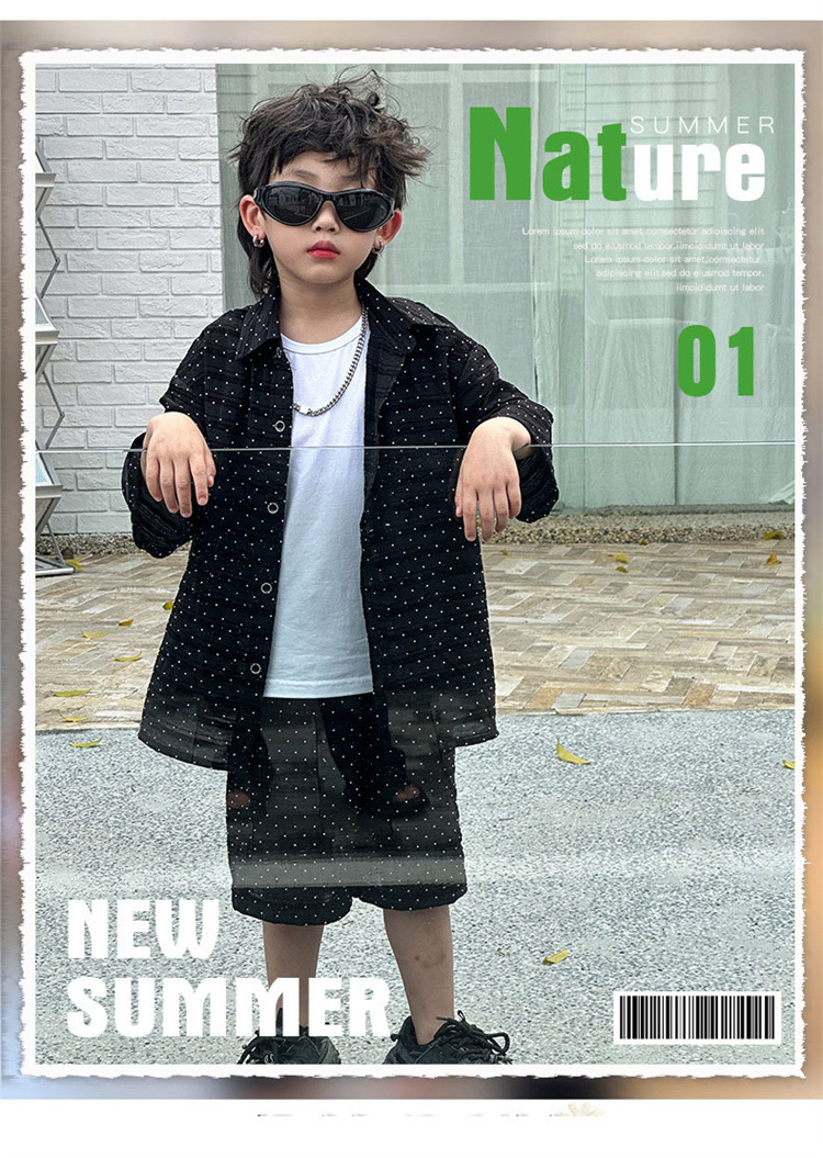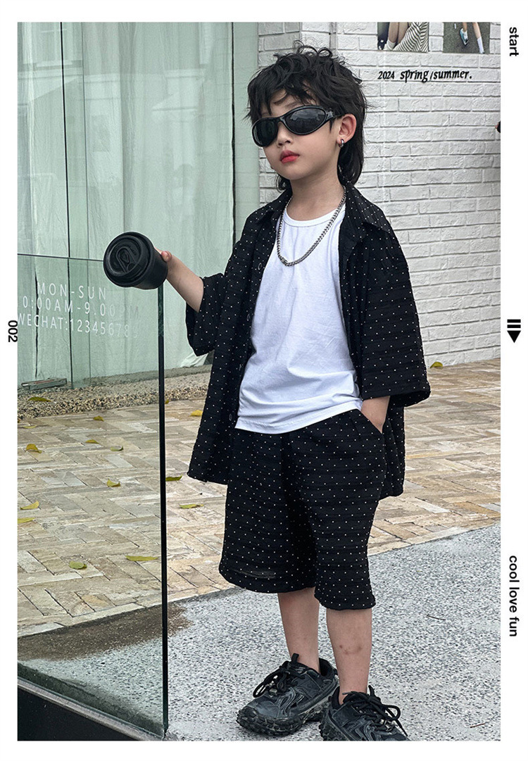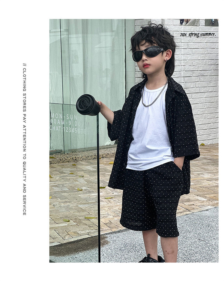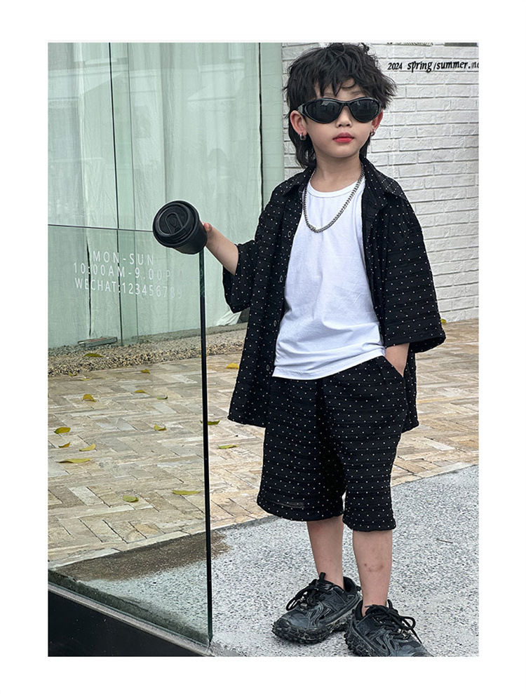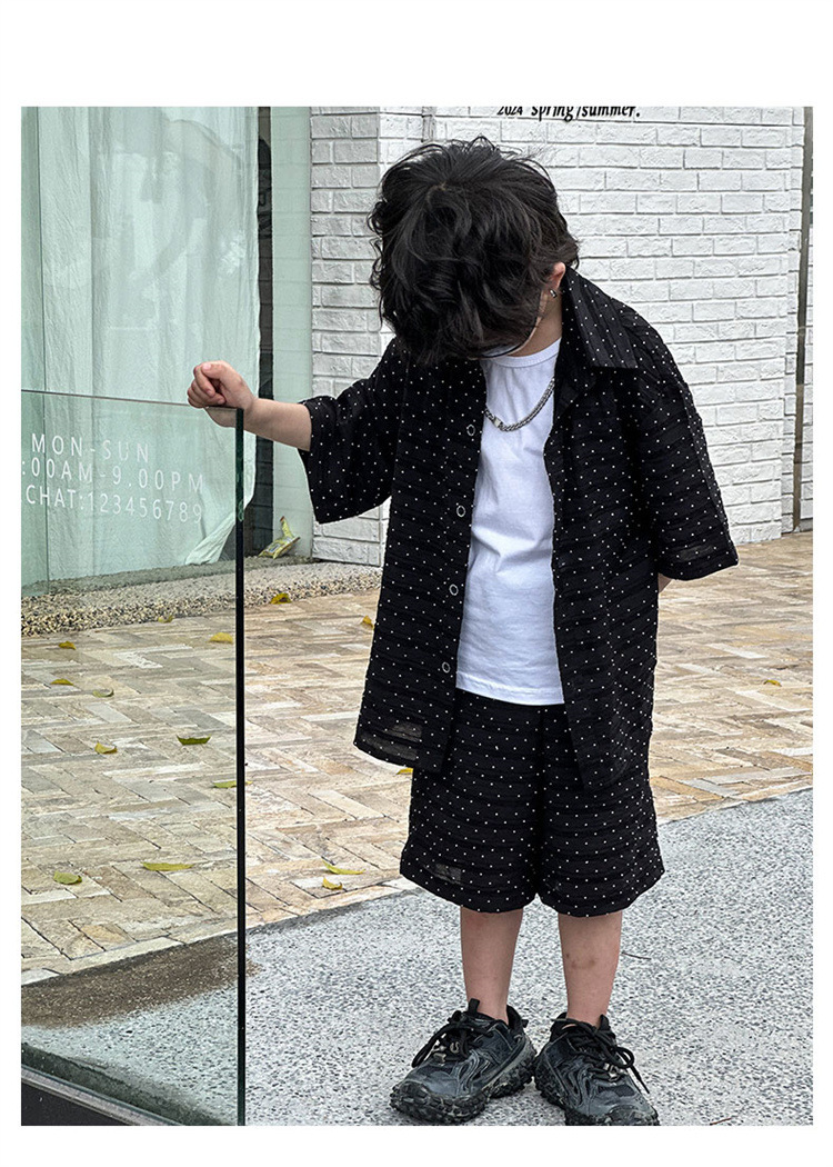남자들의 여름 세트 2024 새로운 러피 잘 생긴 캐주얼 어린이 반팔 통기성 셔츠 멋진 소년 튀긴 거리 아동복