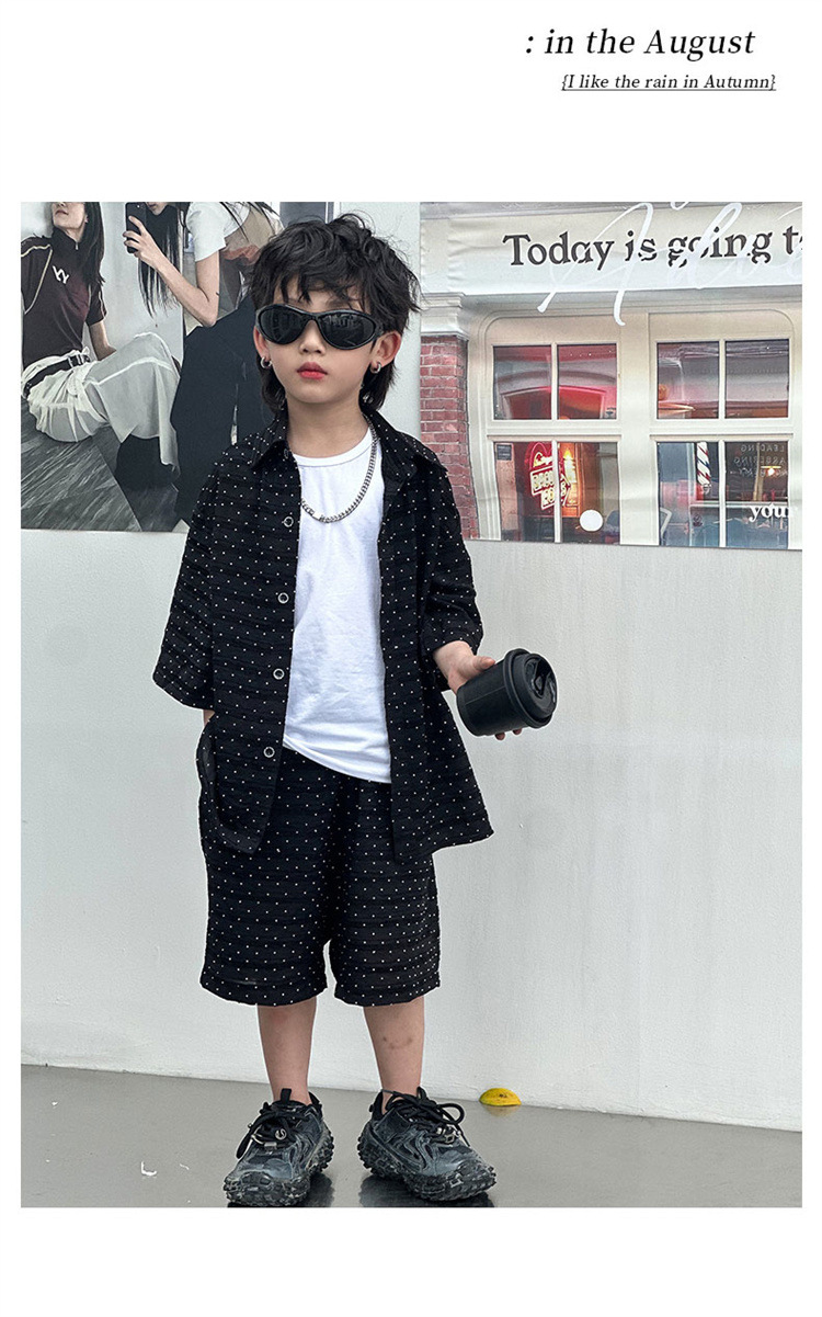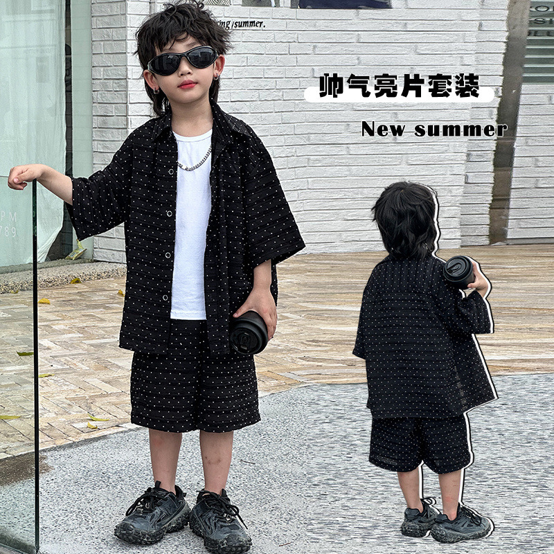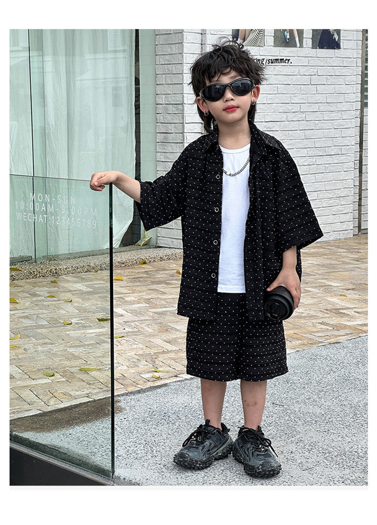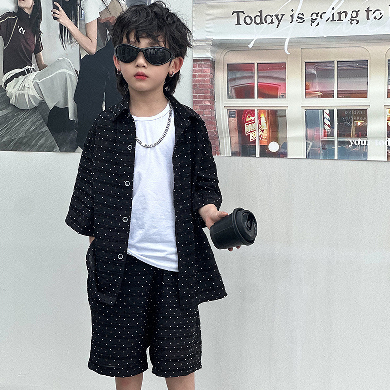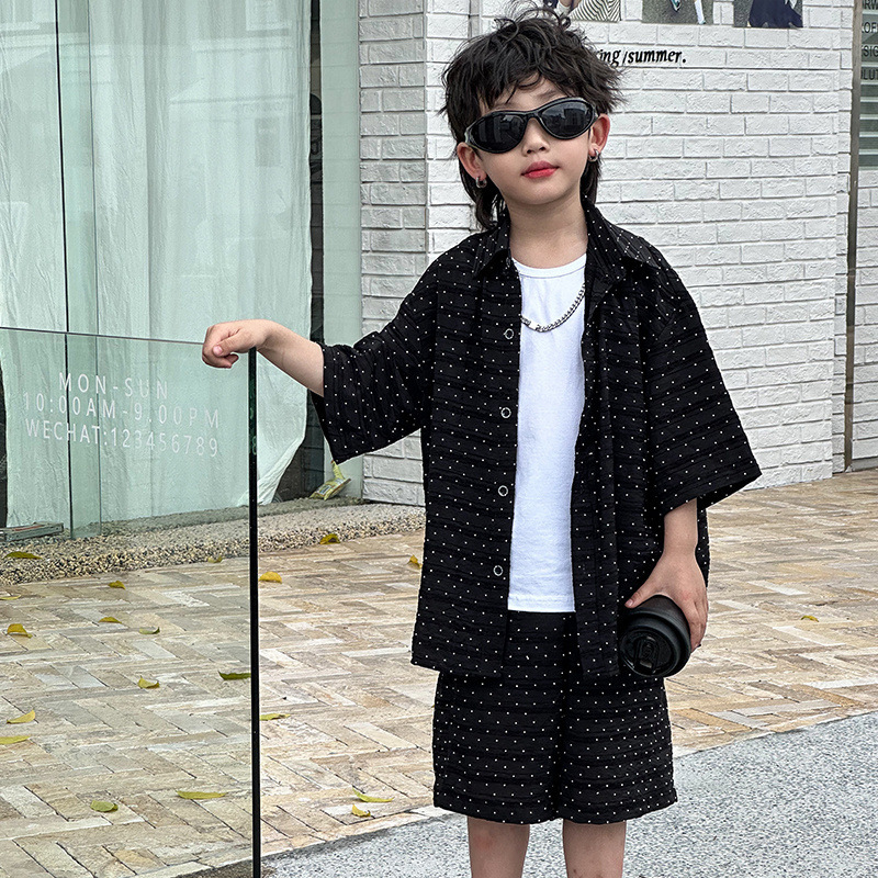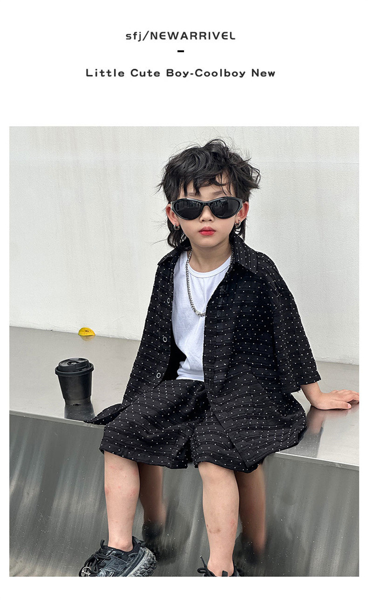남자들의 여름 세트 2024 새로운 러피 잘 생긴 캐주얼 어린이 반팔 통기성 셔츠 멋진 소년 튀긴 거리 아동복