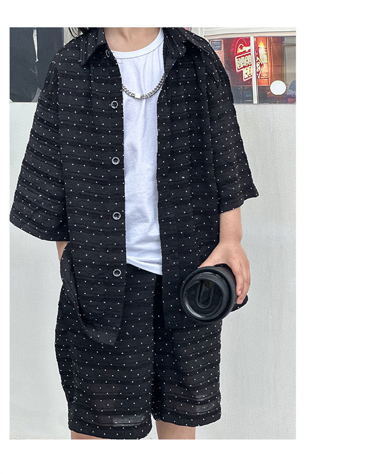 남자들의 여름 세트 2024 새로운 러피 잘 생긴 캐주얼 어린이 반팔 통기성 셔츠 멋진 소년 튀긴 거리 아동복스토어 가기