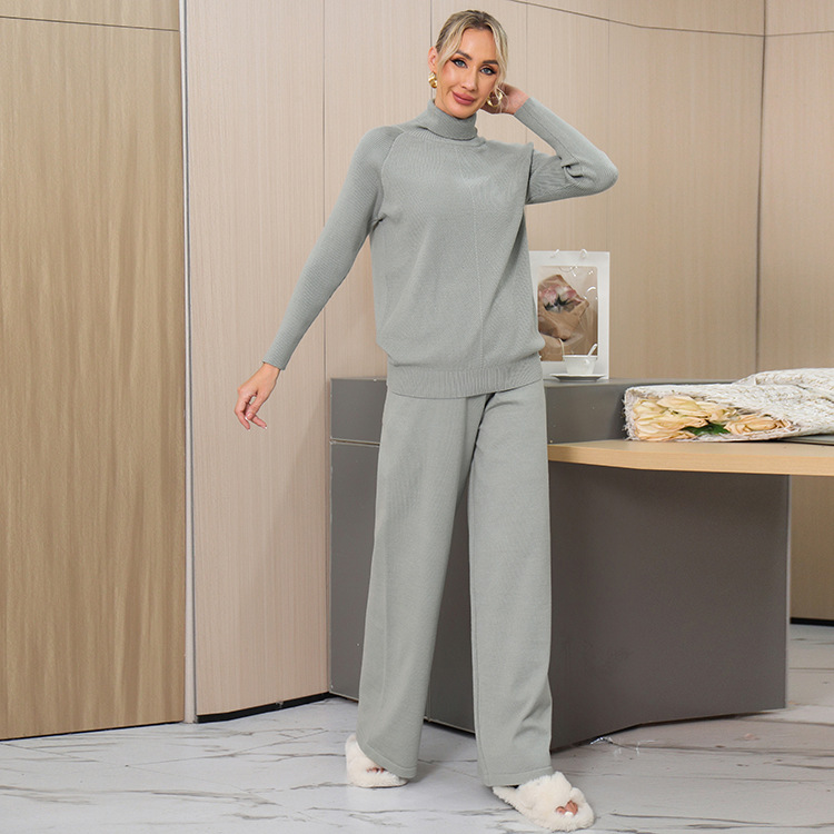 국경을 넘는 단색 높은 목 니트 스웨터 세트 가을과 겨울 2024 새로운 스웨터 캐주얼 와이드 레그 바지 2 피스 세트
