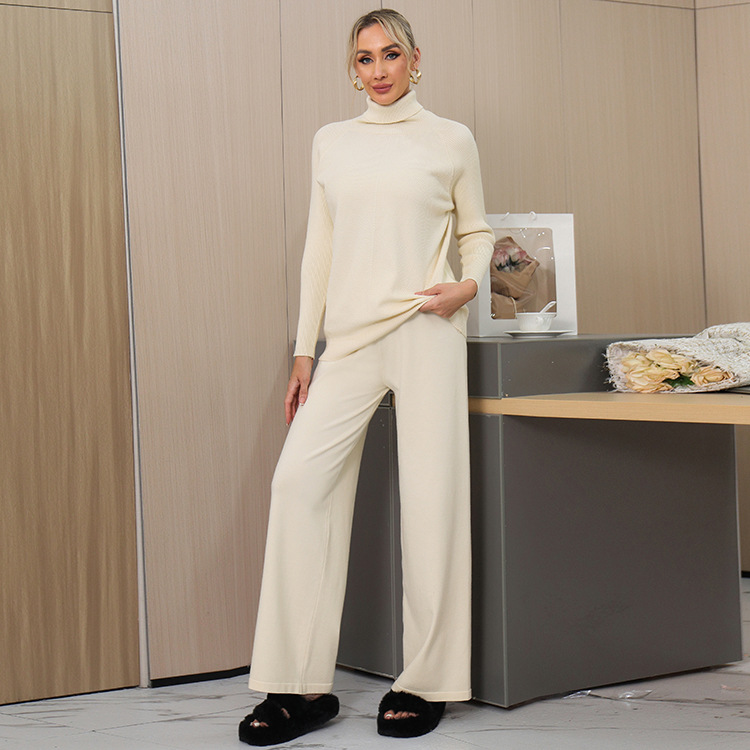 국경을 넘는 단색 높은 목 니트 스웨터 세트 가을과 겨울 2024 새로운 스웨터 캐주얼 와이드 레그 바지 2 피스 세트스토어 가기