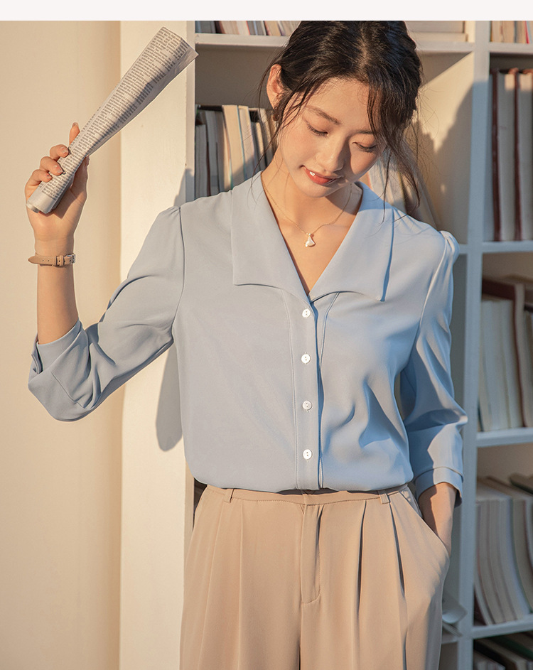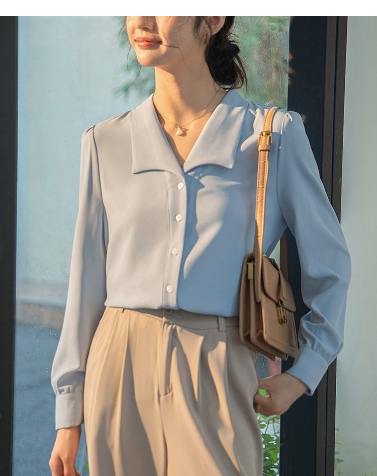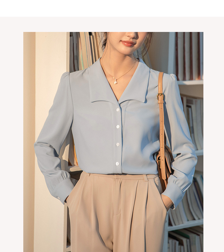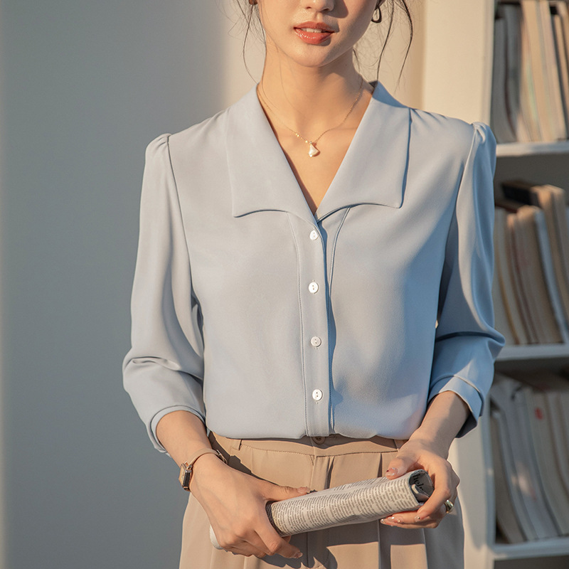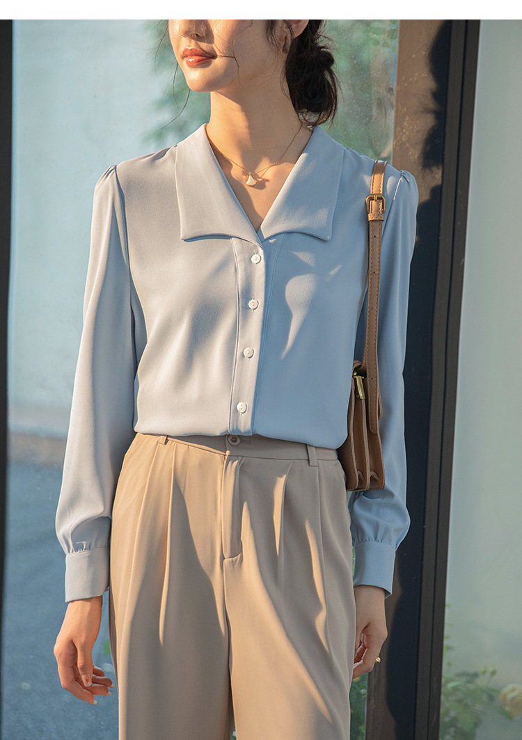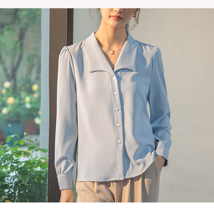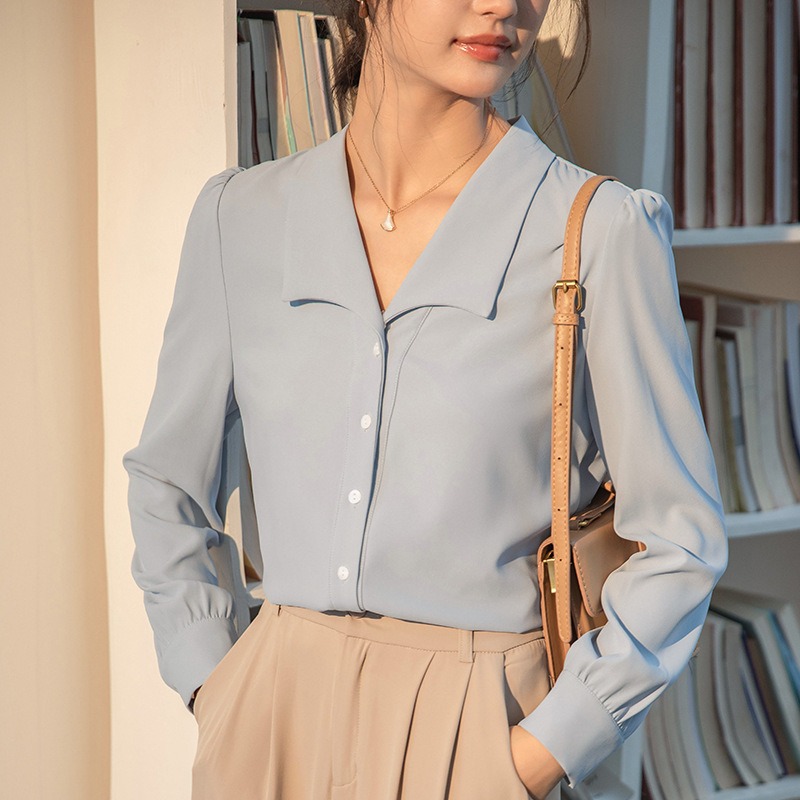 2024 리얼 샷 새로운 블루 긴 소매 셔츠 여성의 가을 경력 통근 셔츠 프랑스 최고 인터뷰 셔츠스토어 가기