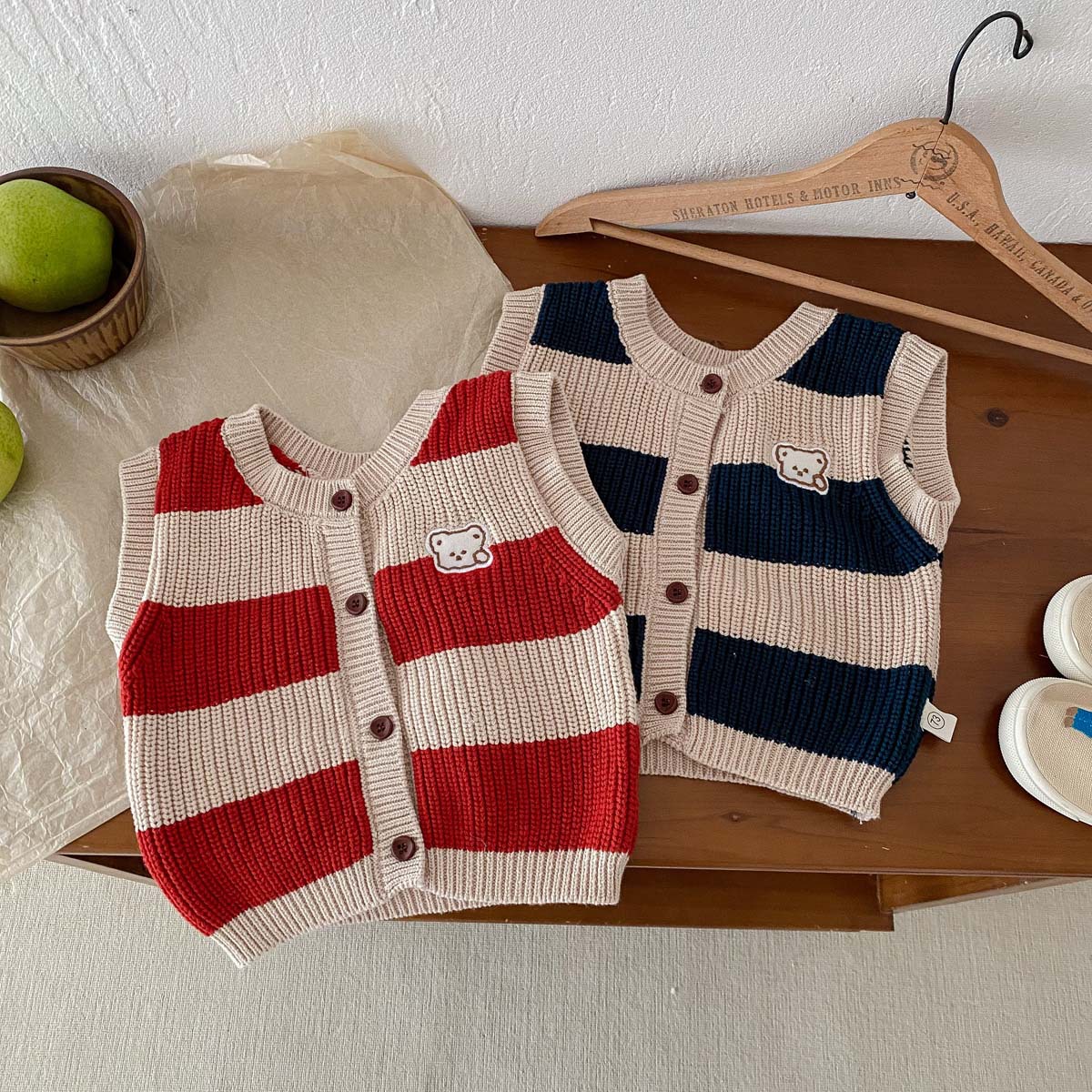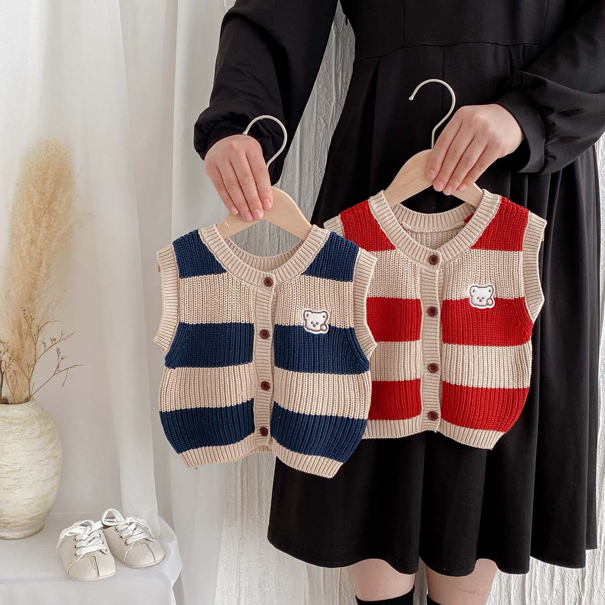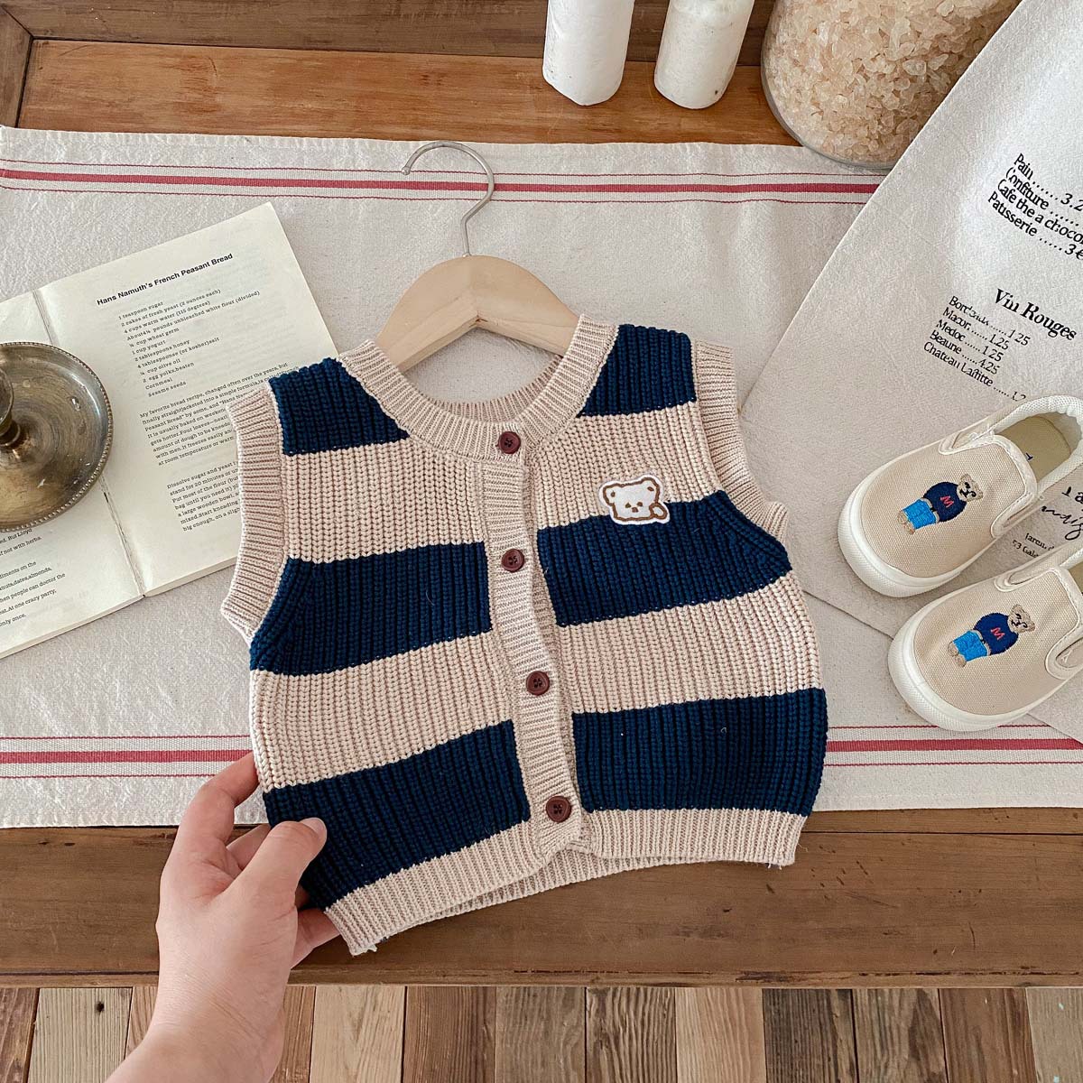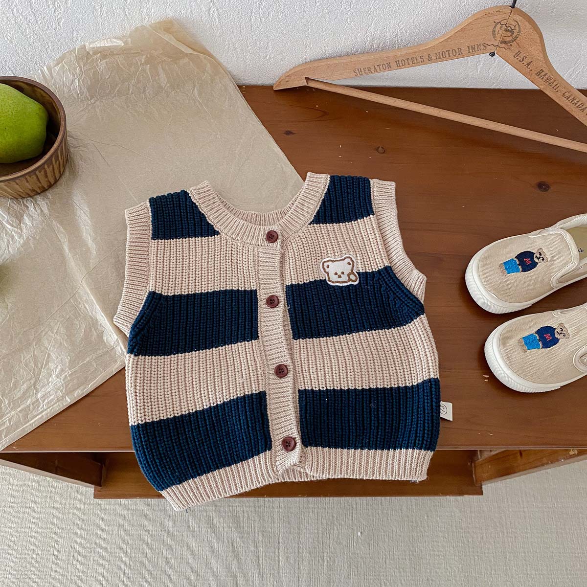 한국 스타일 아동복 아기 가을 새 줄무늬 곰 스웨터 조끼 신생아 아기 소년과 소녀 니트 카디건 조끼