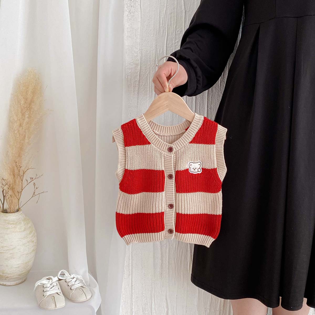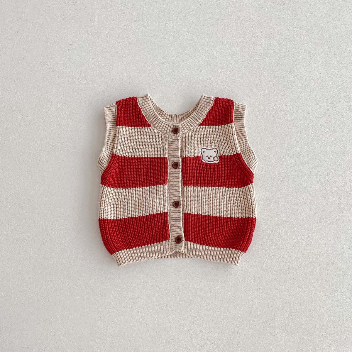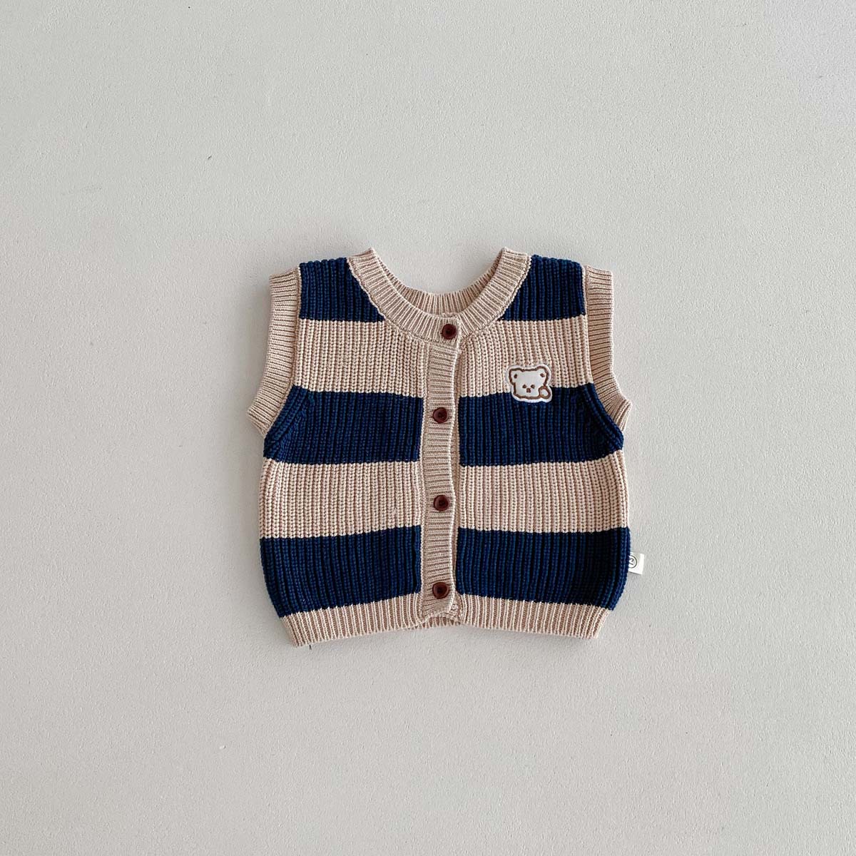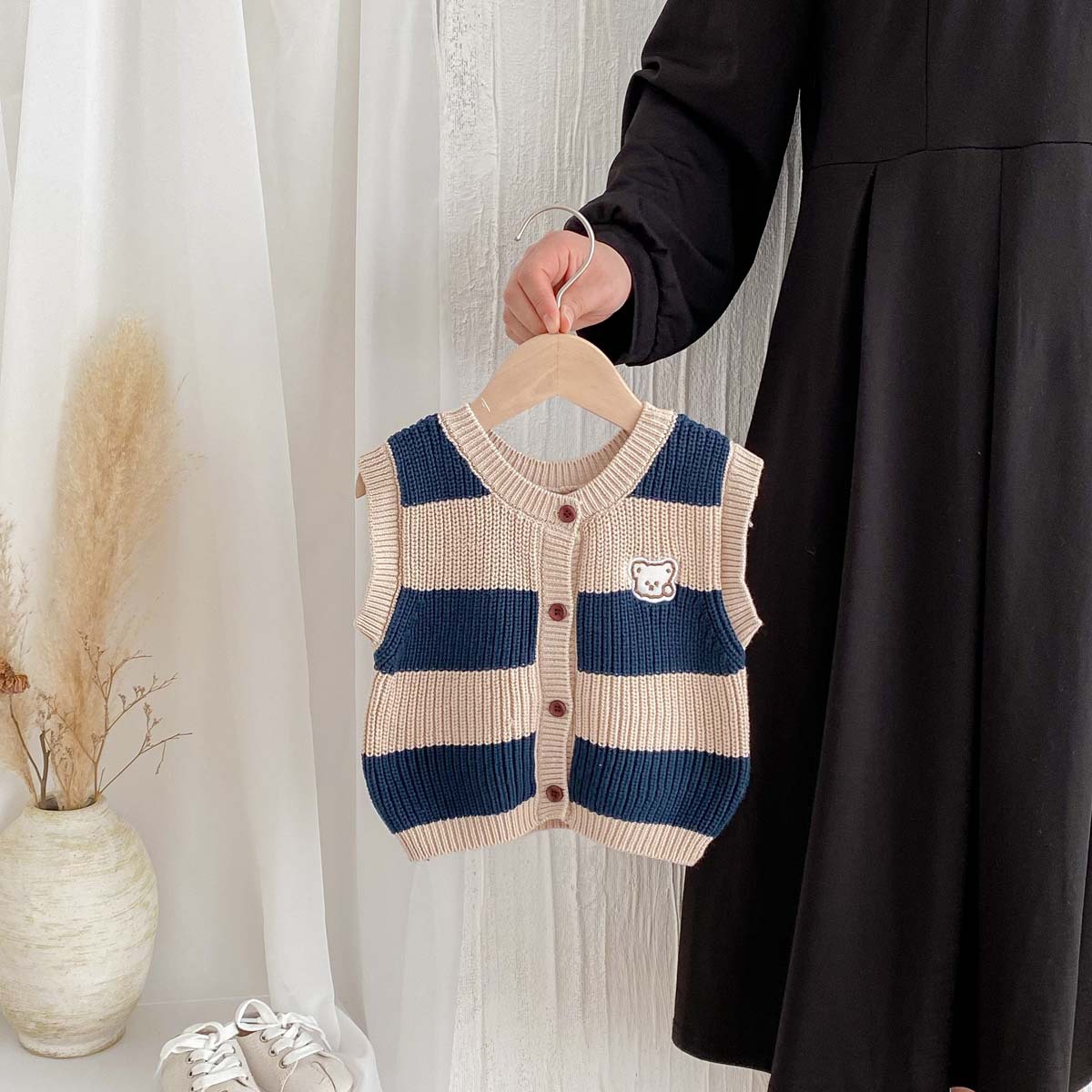한국 스타일 아동복 아기 가을 새 줄무늬 곰 스웨터 조끼 신생아 아기 소년과 소녀 니트 카디건 조끼