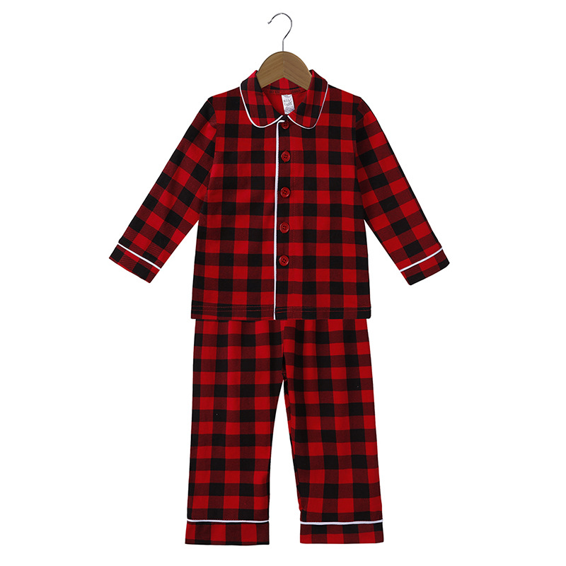 【款式】欧美跨境圣诞节新款儿童秋冬睡衣套装红黑格子长袖棉质男童女童婴幼童家居服两件套