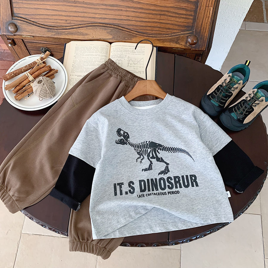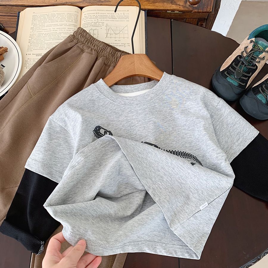 남아용 긴팔 티셔츠 2025 가을 신상 아동용 페이크 투피스 순면 공룡 캐주얼 루즈핏 상의 풀오버