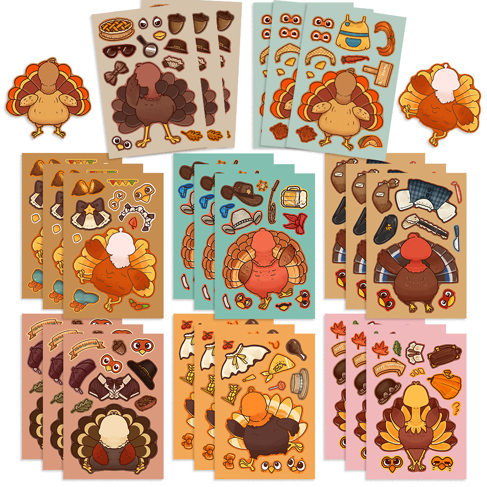 • 추수감사절 칠면조 퍼즐 스티커 8개 - 재미있는 DIY 콜라주