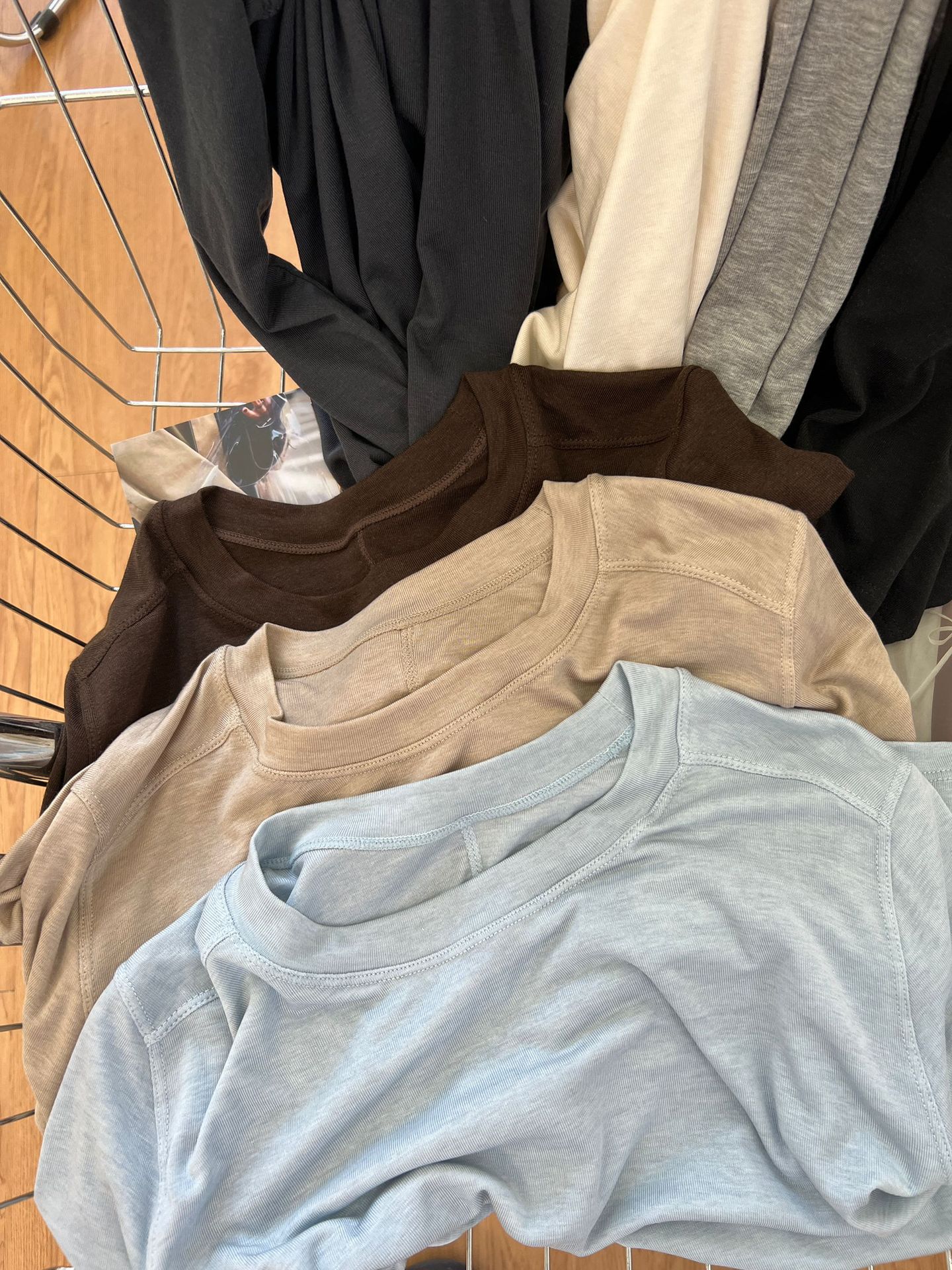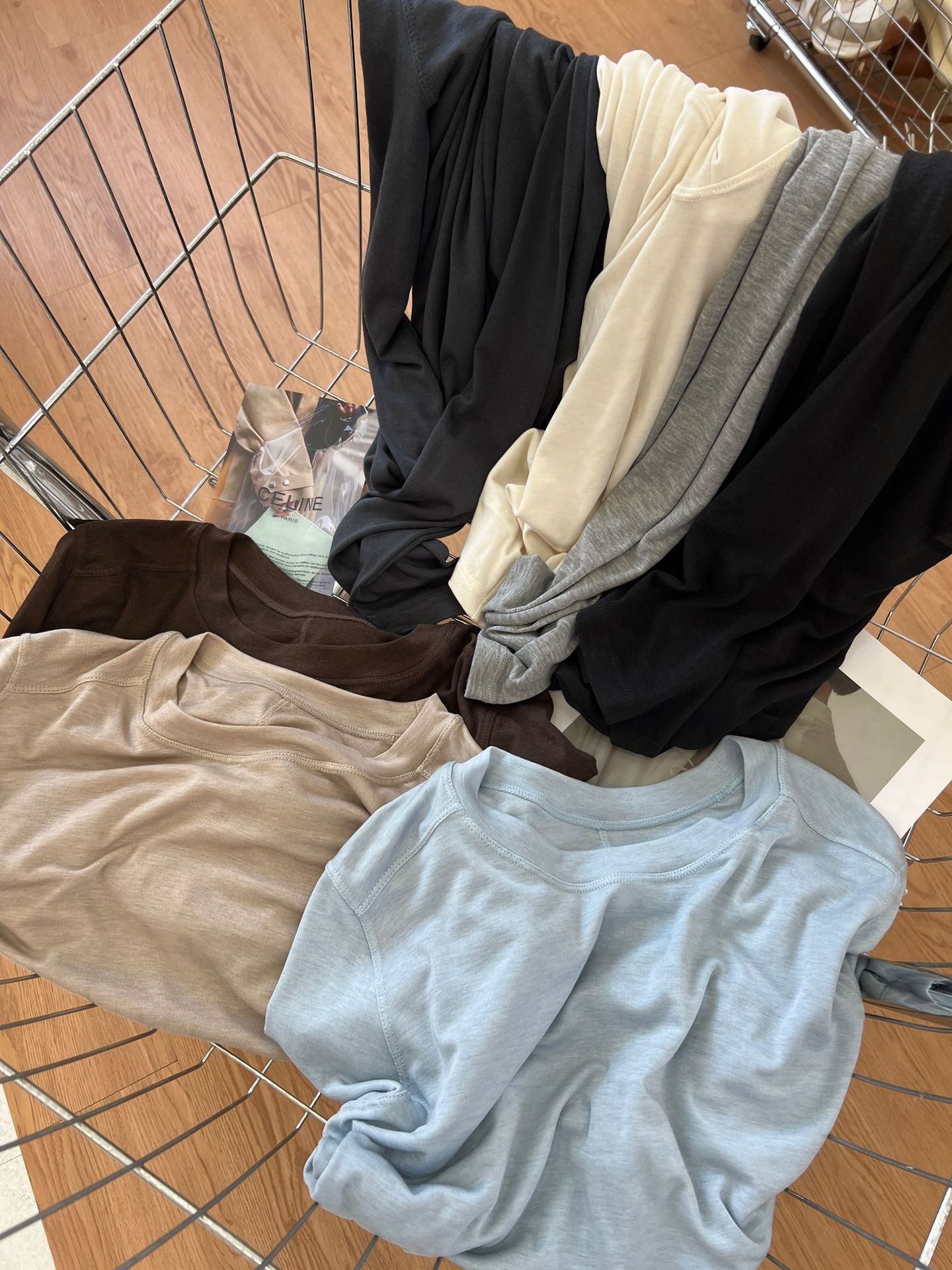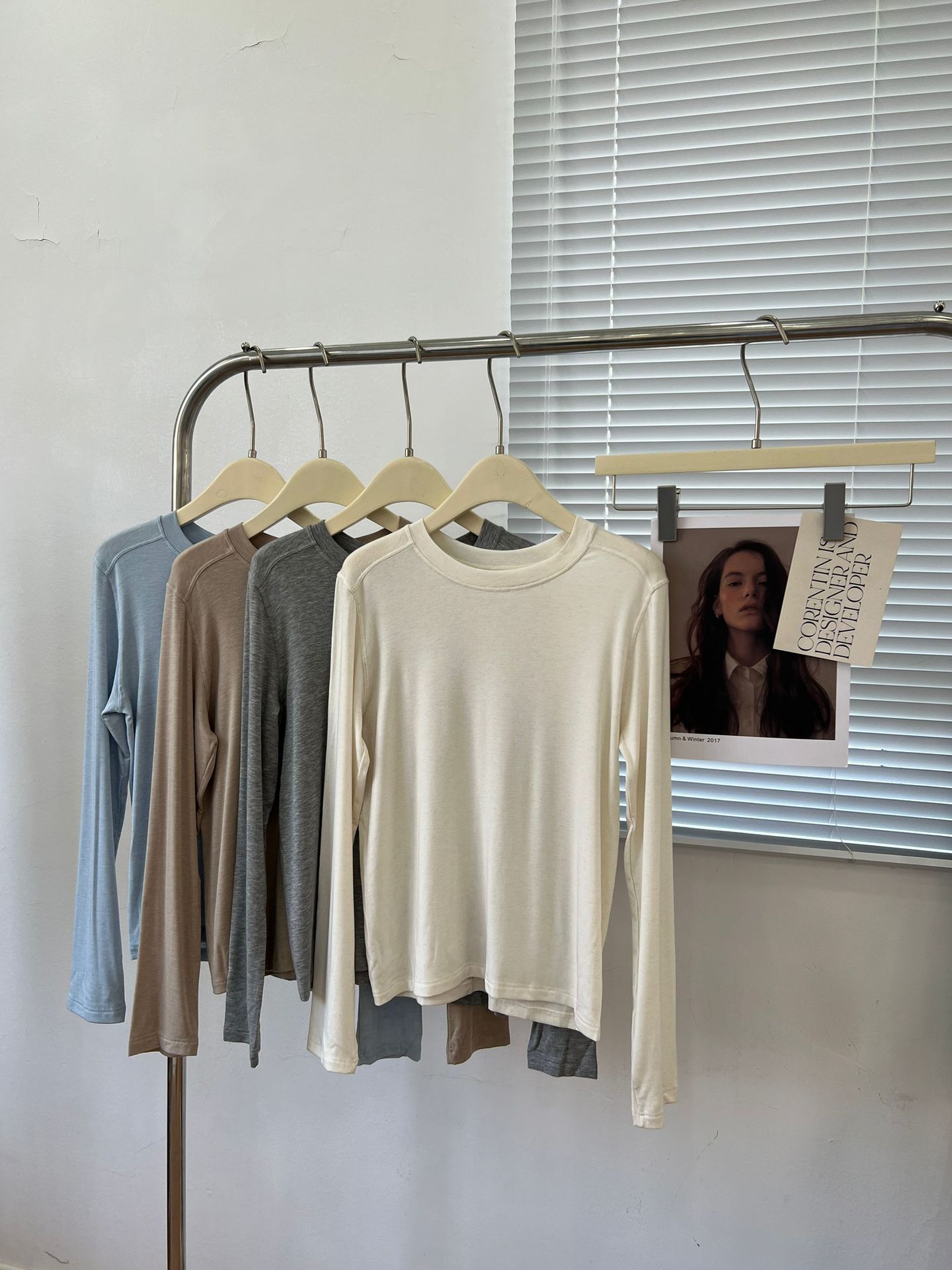 봄과 가을 신상 얇은 울 텐셀 부드럽고 왁시한 라운드 넥 바닥 셔츠 슬림핏 긴팔 티셔츠 여성상의스토어 가기