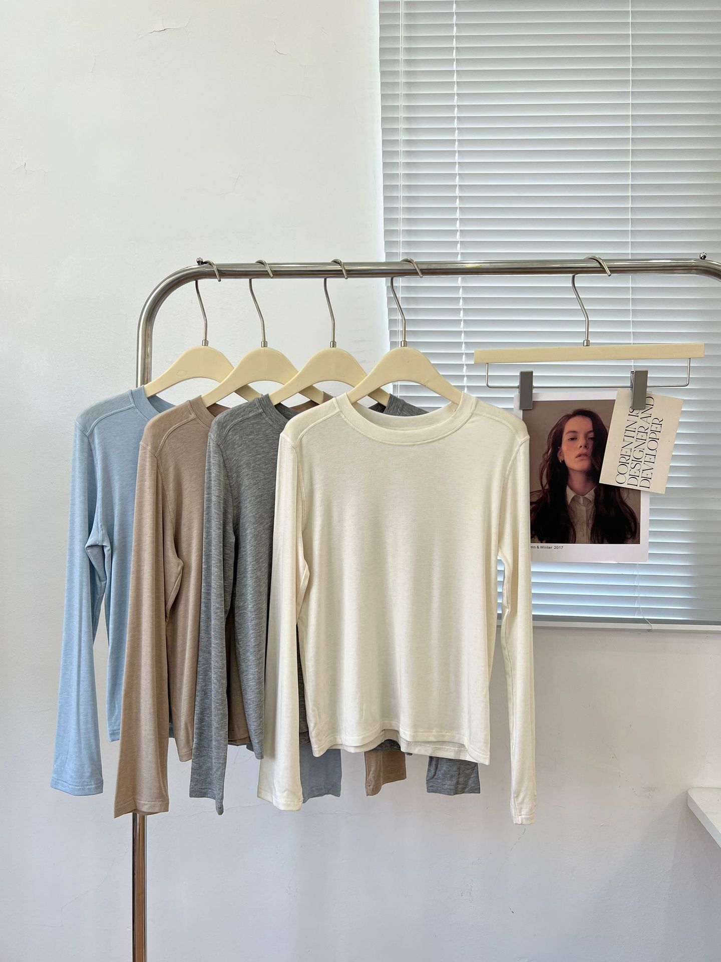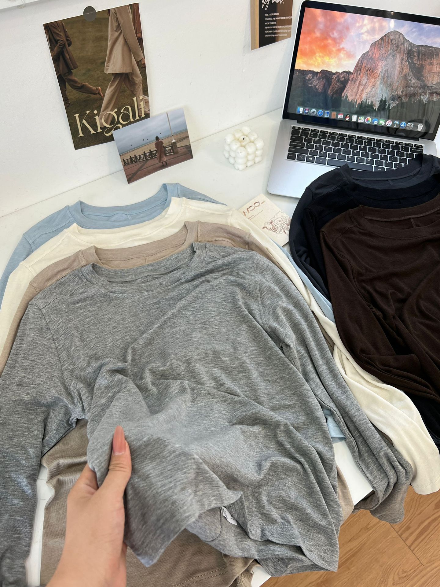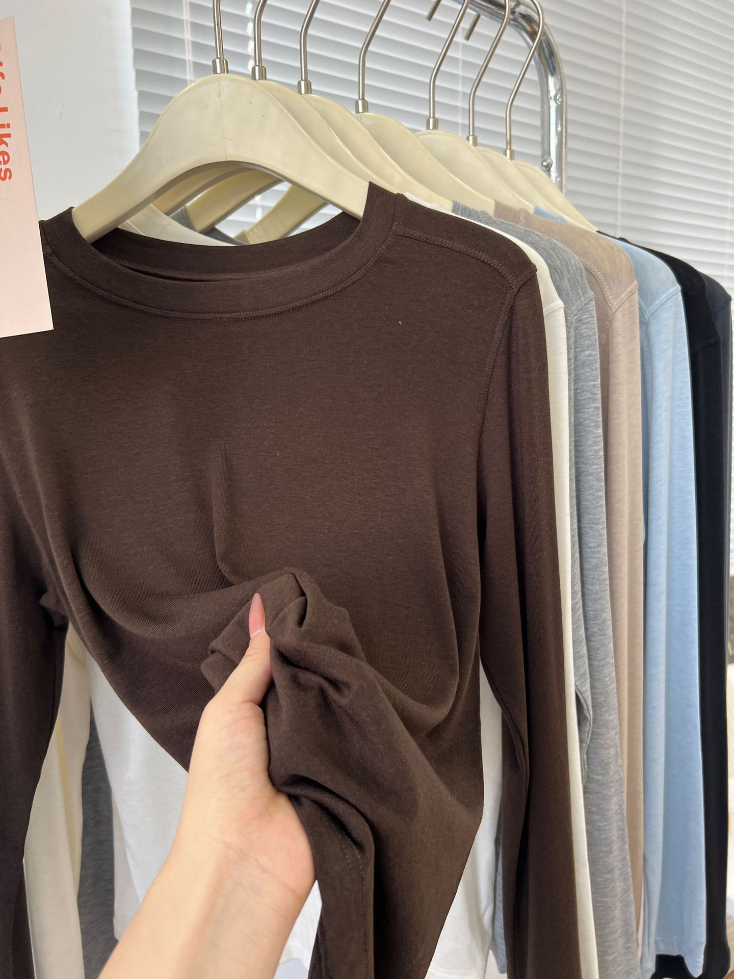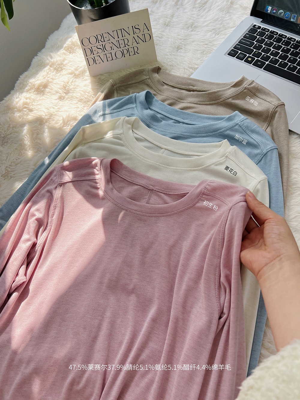 봄과 가을 신상 얇은 울 텐셀 부드럽고 왁시한 라운드 넥 바닥 셔츠 슬림핏 긴팔 티셔츠 여성상의