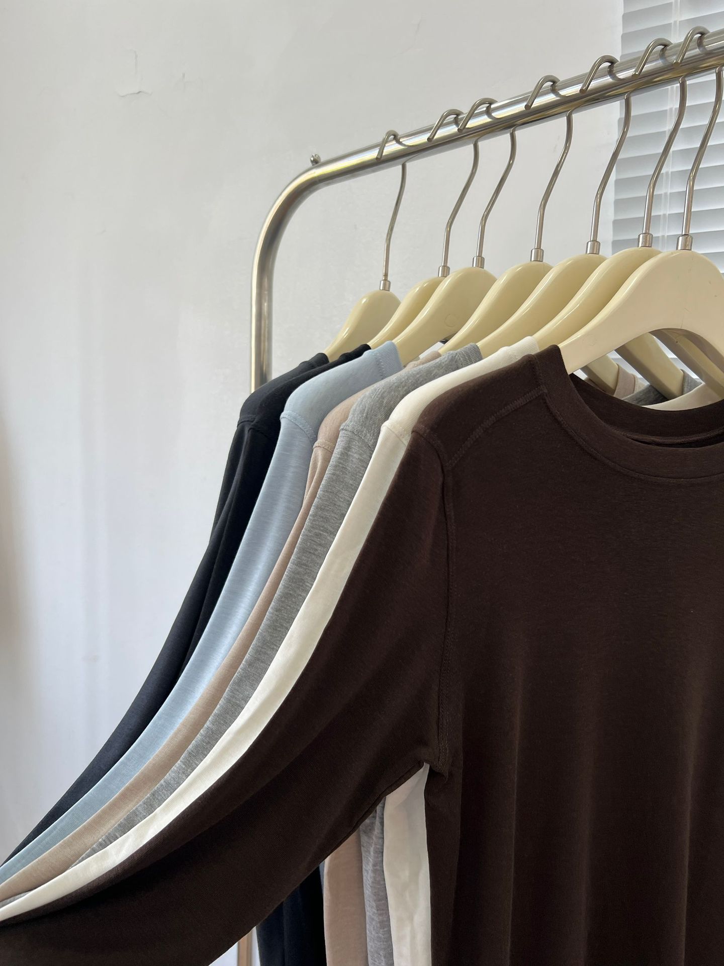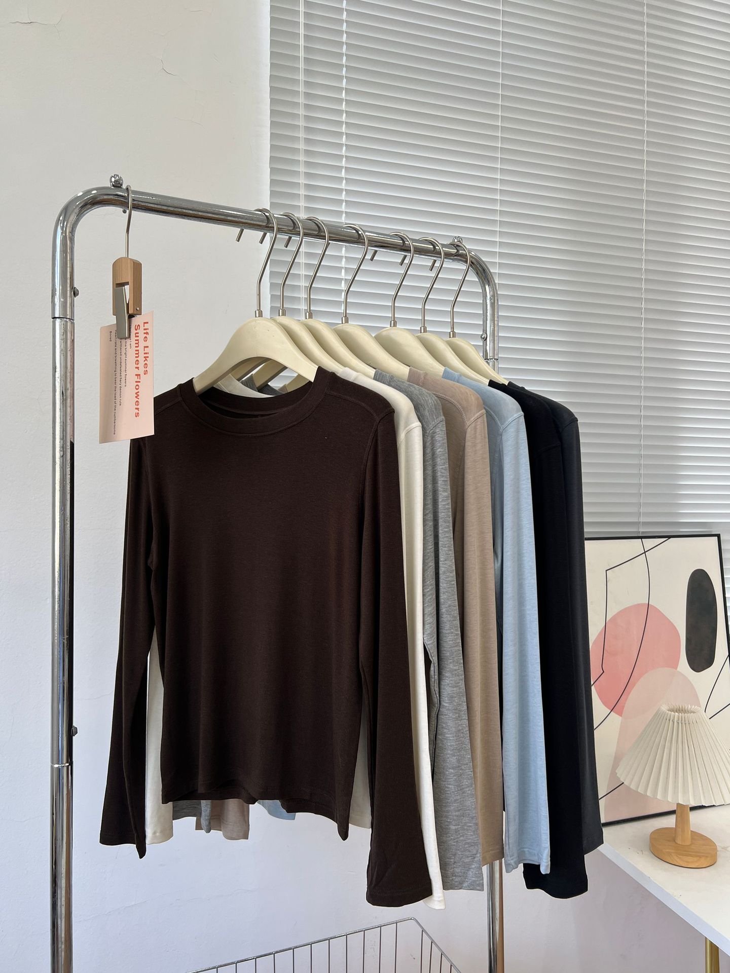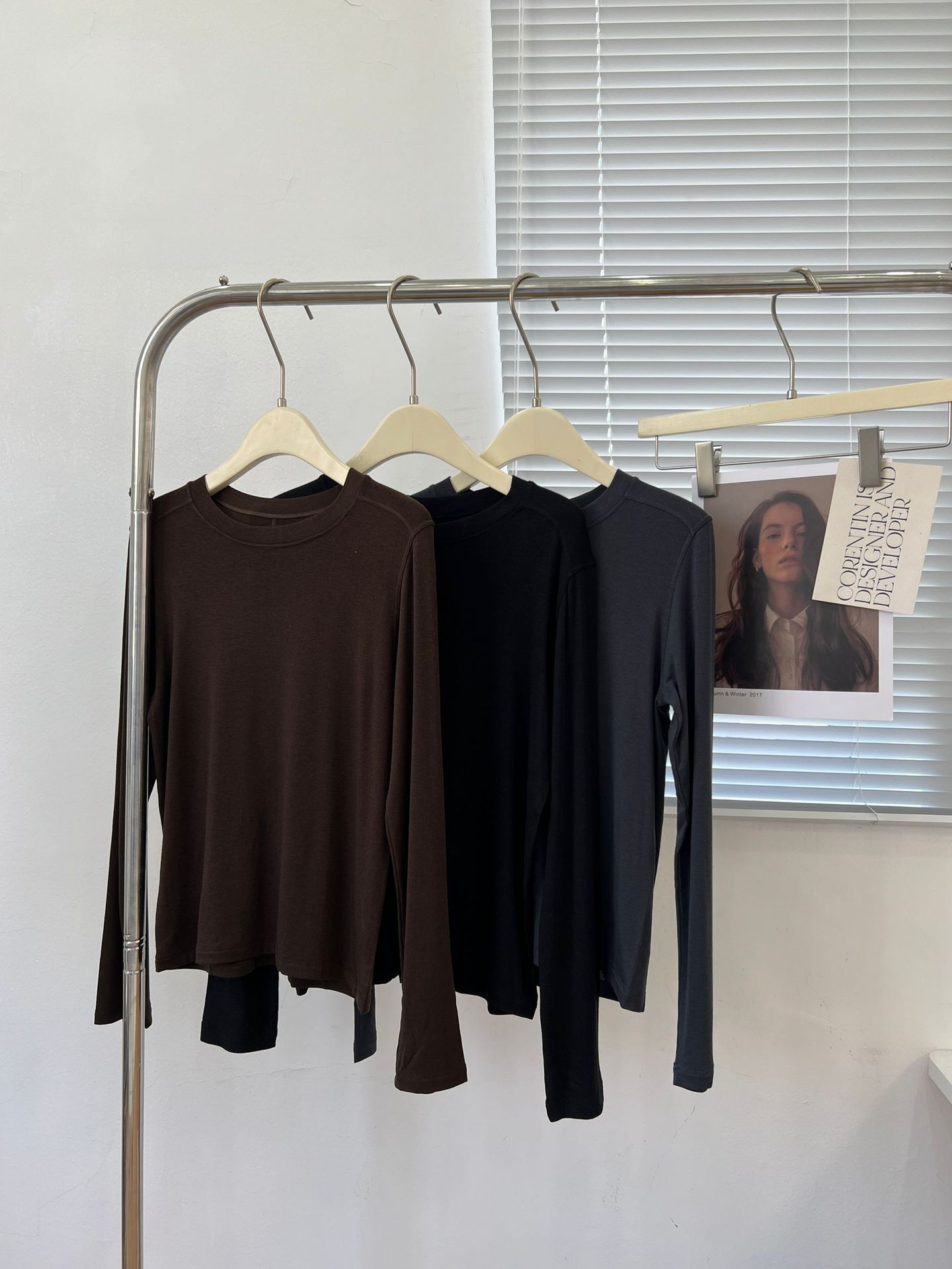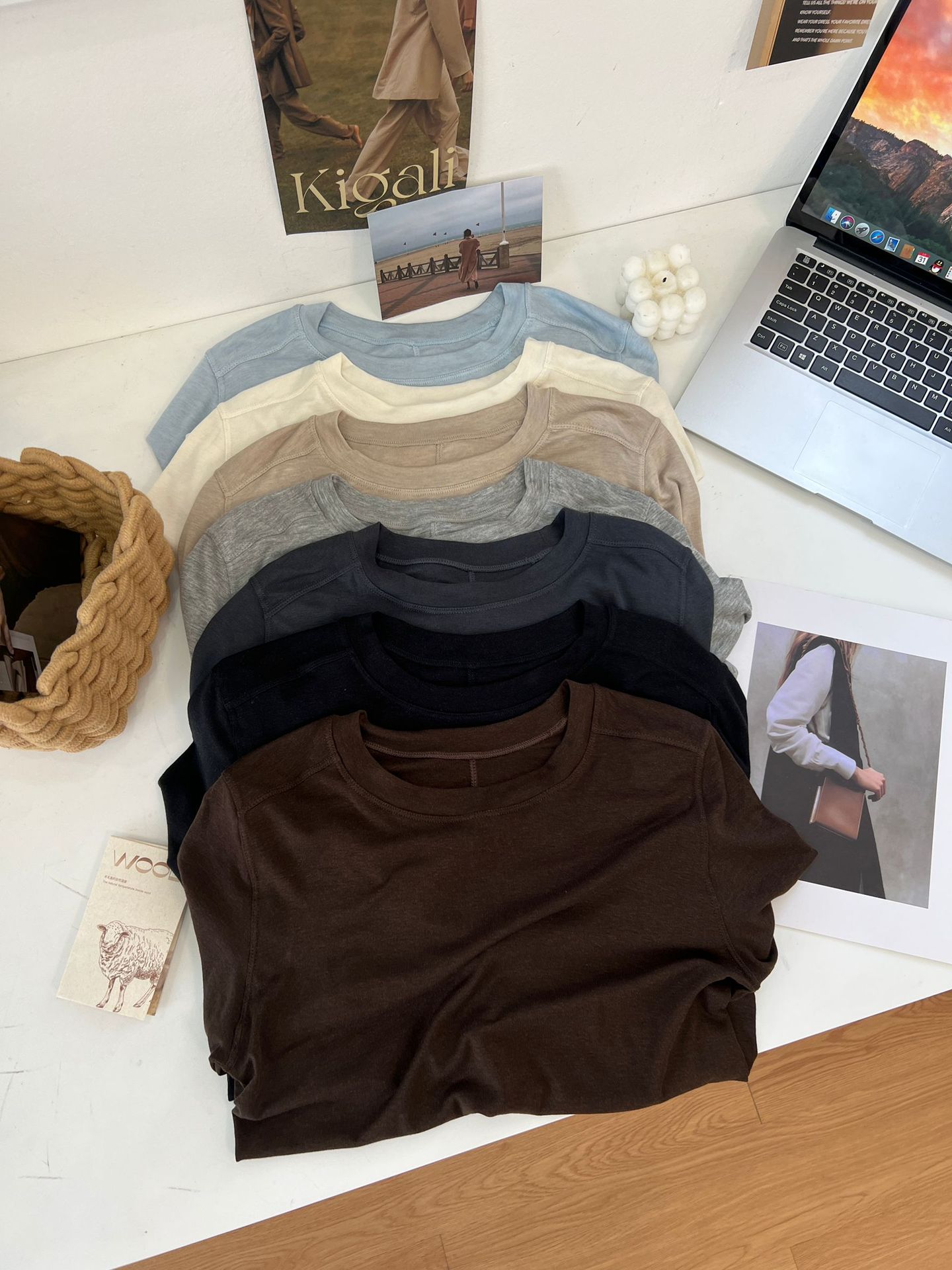봄과 가을 신상 얇은 울 텐셀 부드럽고 왁시한 라운드 넥 바닥 셔츠 슬림핏 긴팔 티셔츠 여성상의