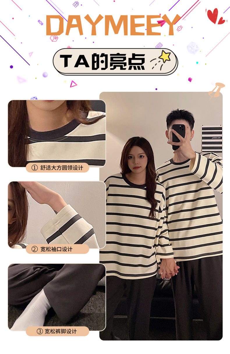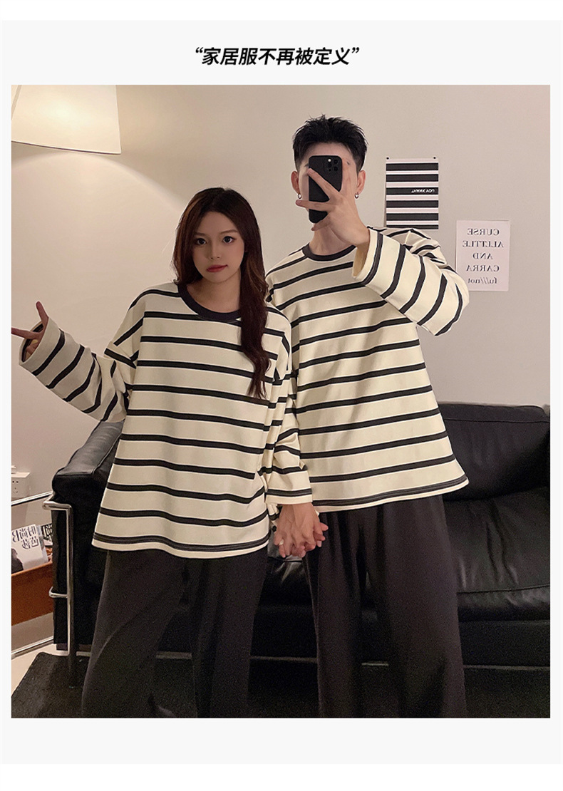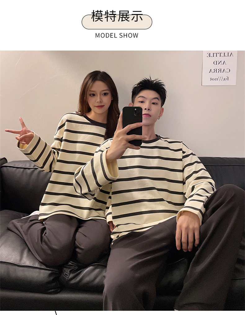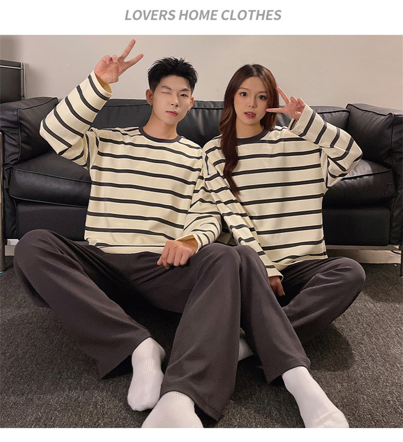 봄과 가을 새 잠옷 커플 남자와 여자 줄무늬 모조 면 크루 넥 풀오버 긴 소매 바지 캐주얼 홈 세트 도매스토어 가기