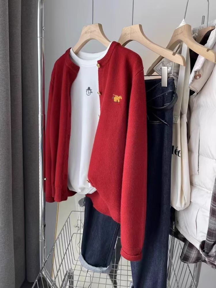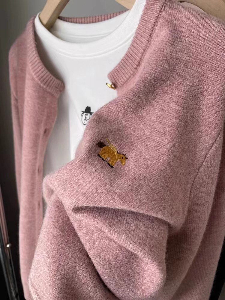 카툰 포니 패션 라운드넥 100% 순모 가디건 여성 니트 스웨터 숏 코트 메탈 버튼 울 탑