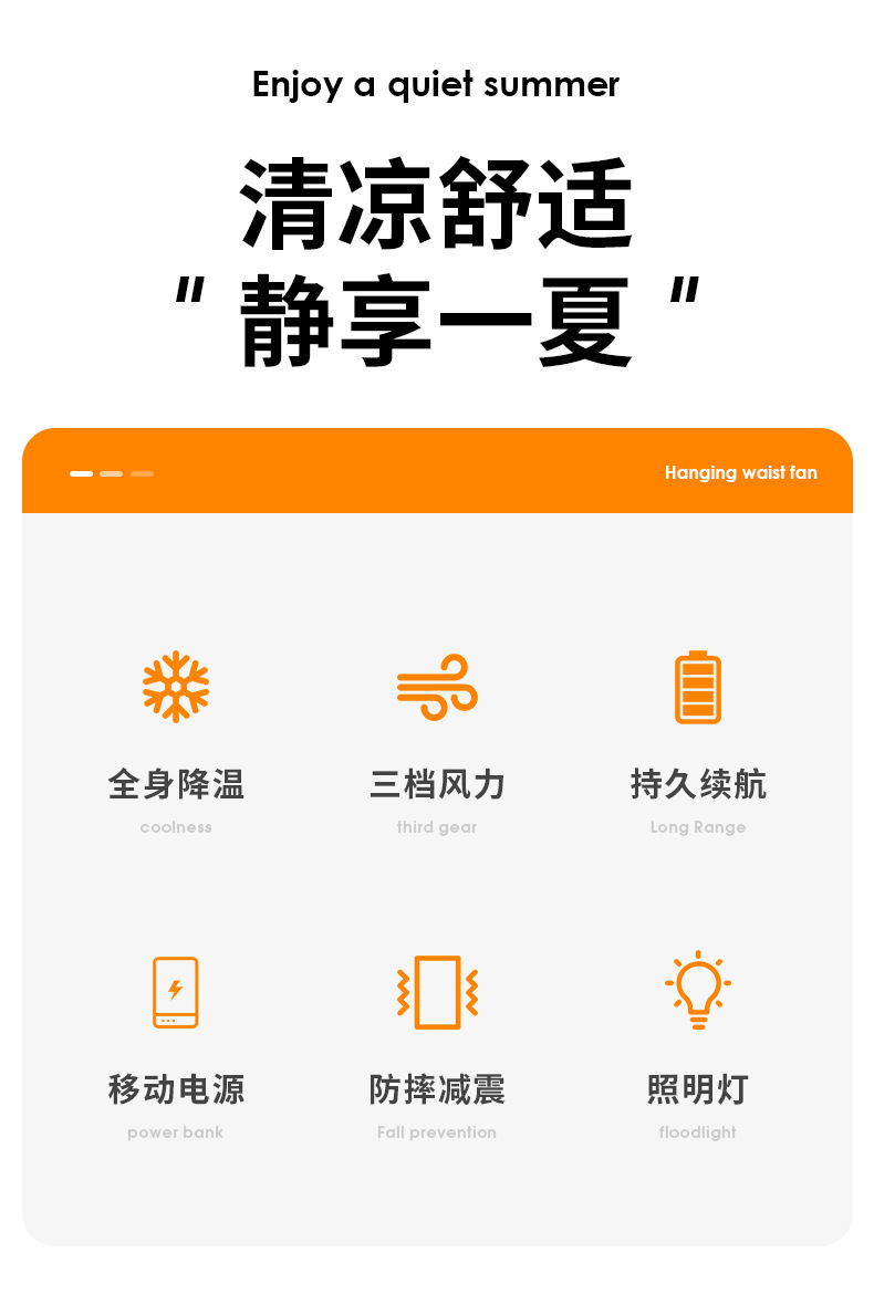 • 추락 방지 F49 허리 걸이 팬 오렌지 + 벨트 * 보조베터리 + 야간 조명 * 4000 mAh
