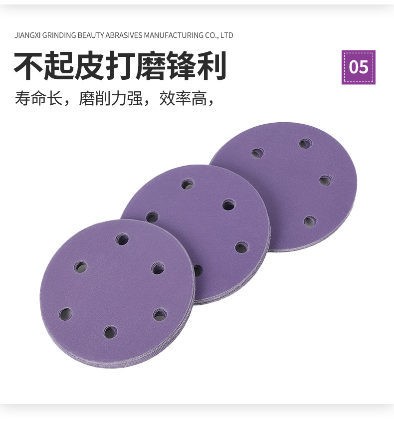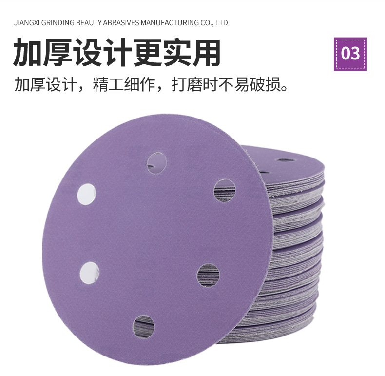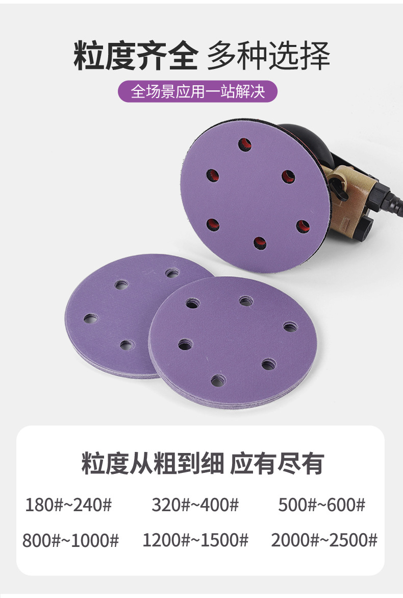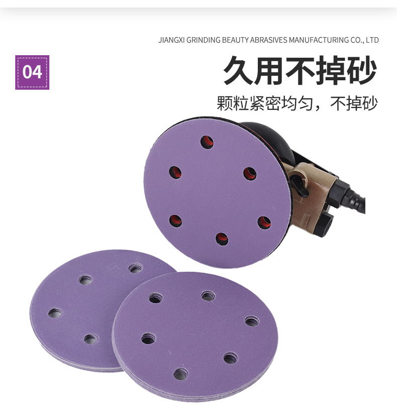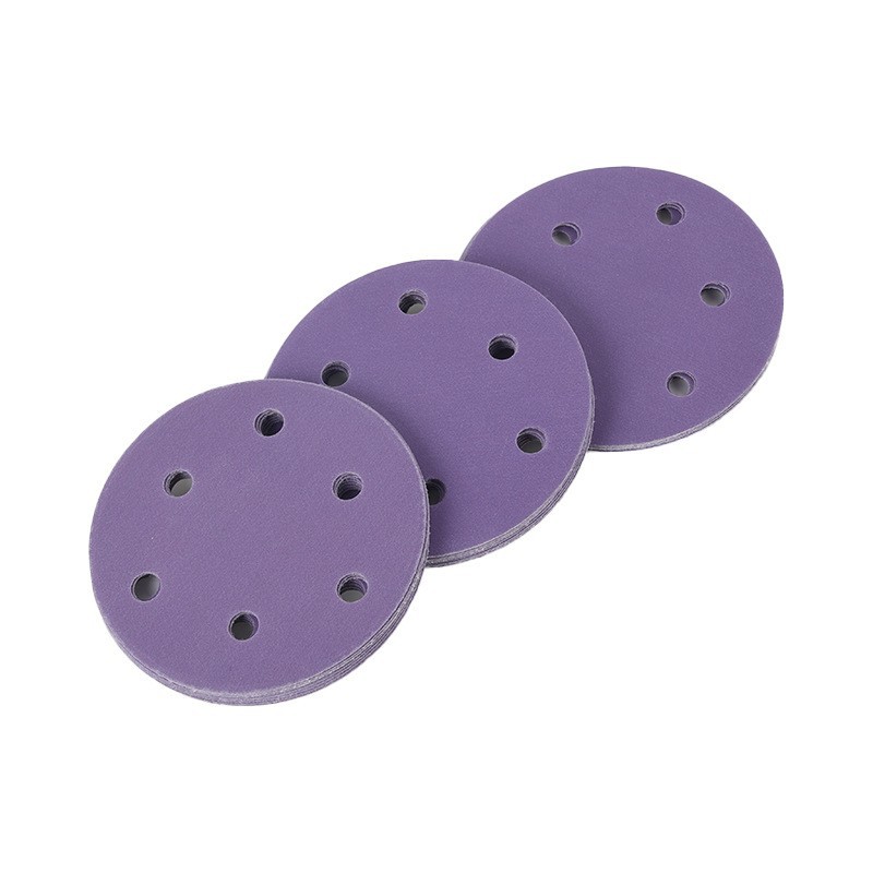 공장 현장 5인치 6홀 건식 연마 사포 원형 디스크 사포 자동차 연마 및 연마 세라믹 보라색 모래 플로킹 사포 시트
