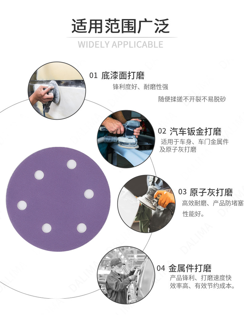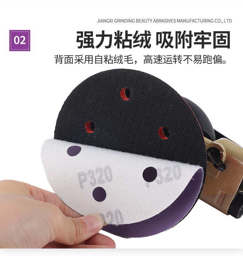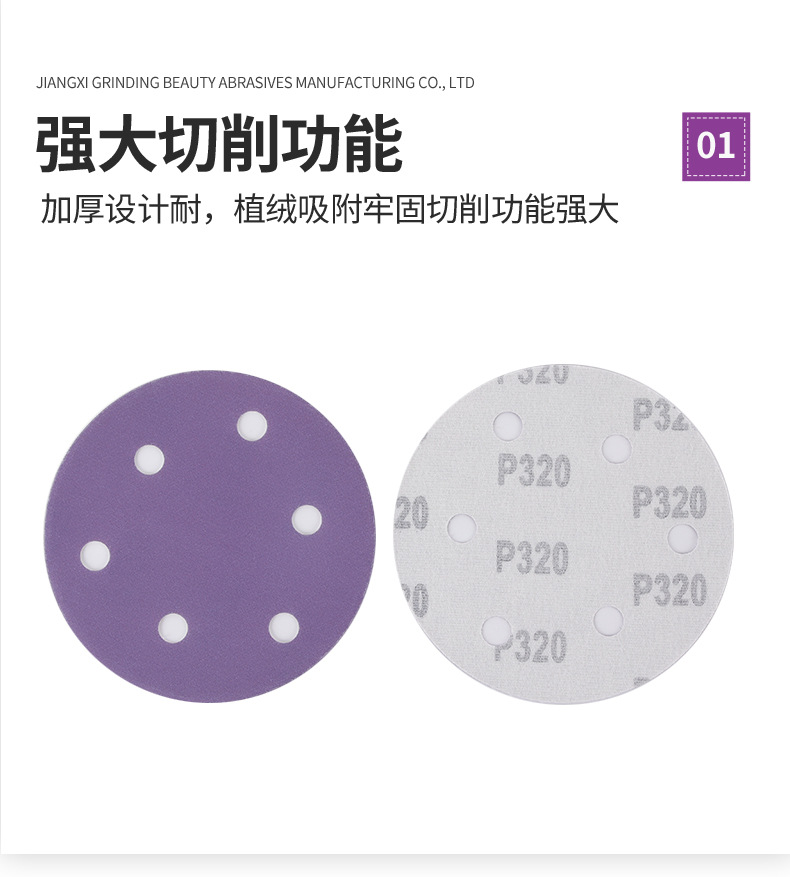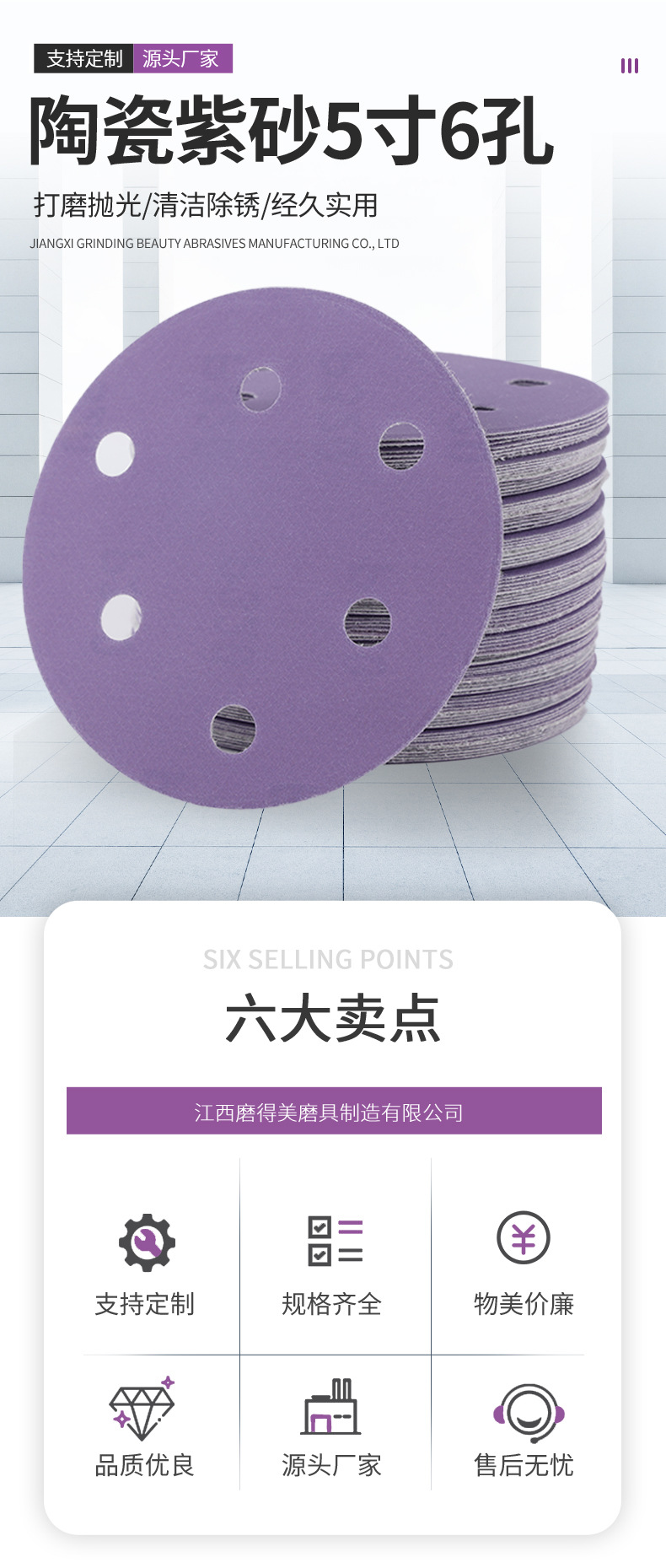 공장 현장 5인치 6홀 건식 연마 사포 원형 디스크 사포 자동차 연마 및 연마 세라믹 보라색 모래 플로킹 사포 시트