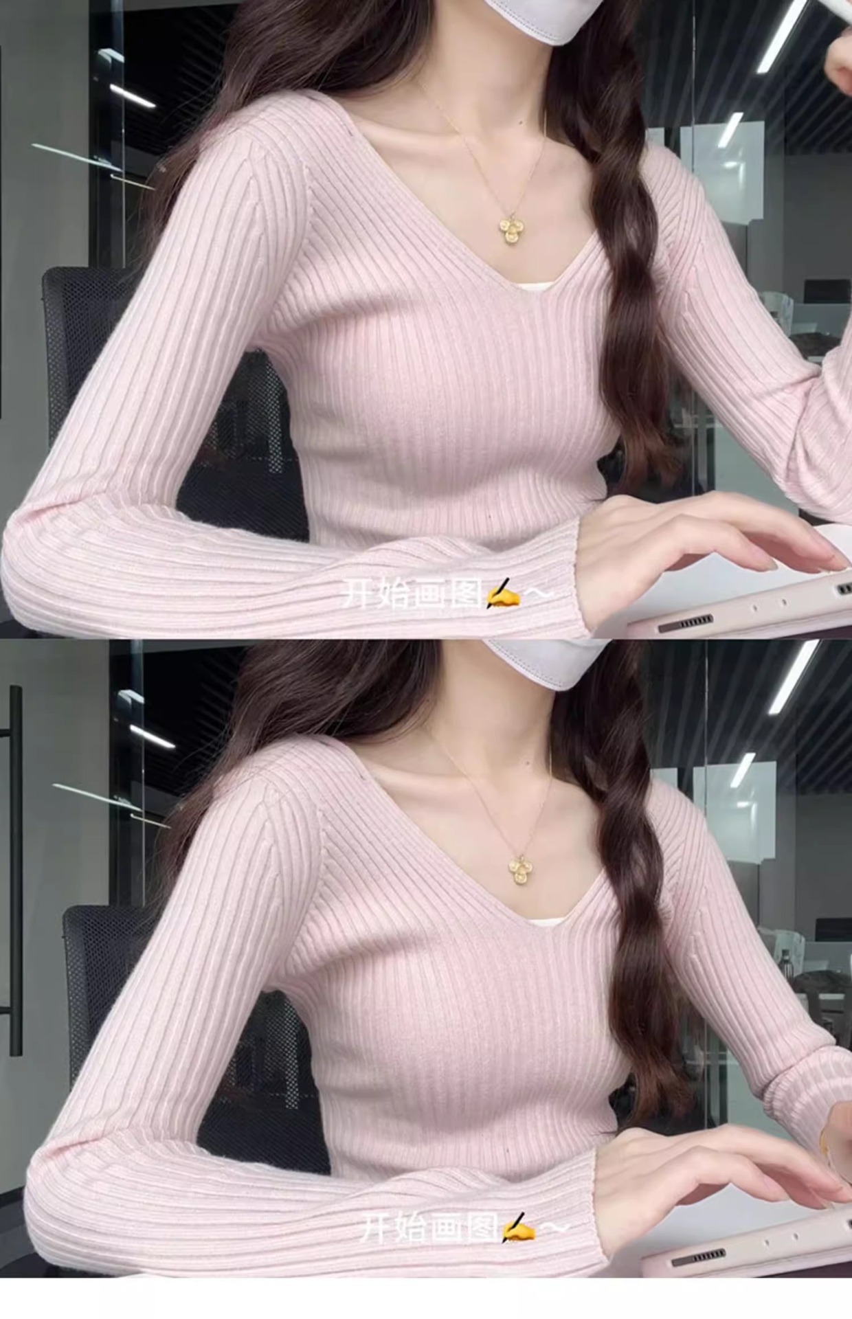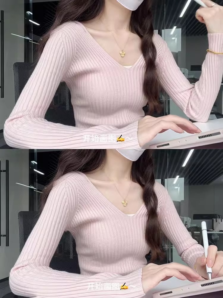 순수 핑크 V 넥 스웨터 여성의 가을 내부 슬림 핏 긴소매베이스 짧은 부드러운 기질 오프 숄더 탑