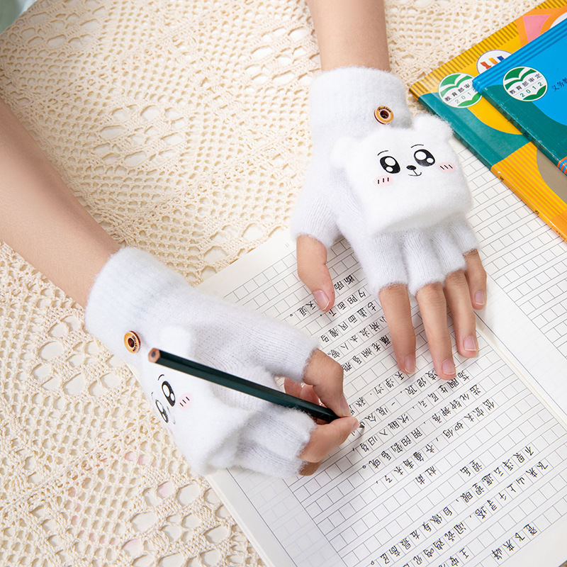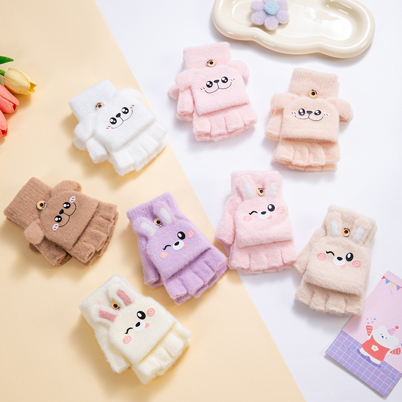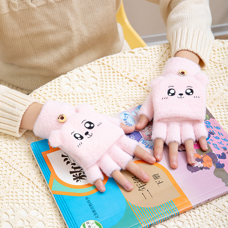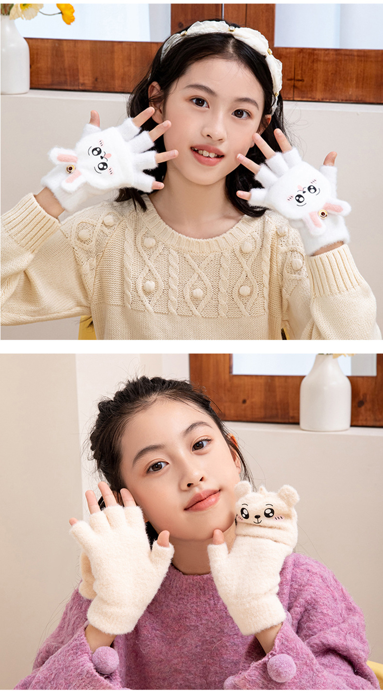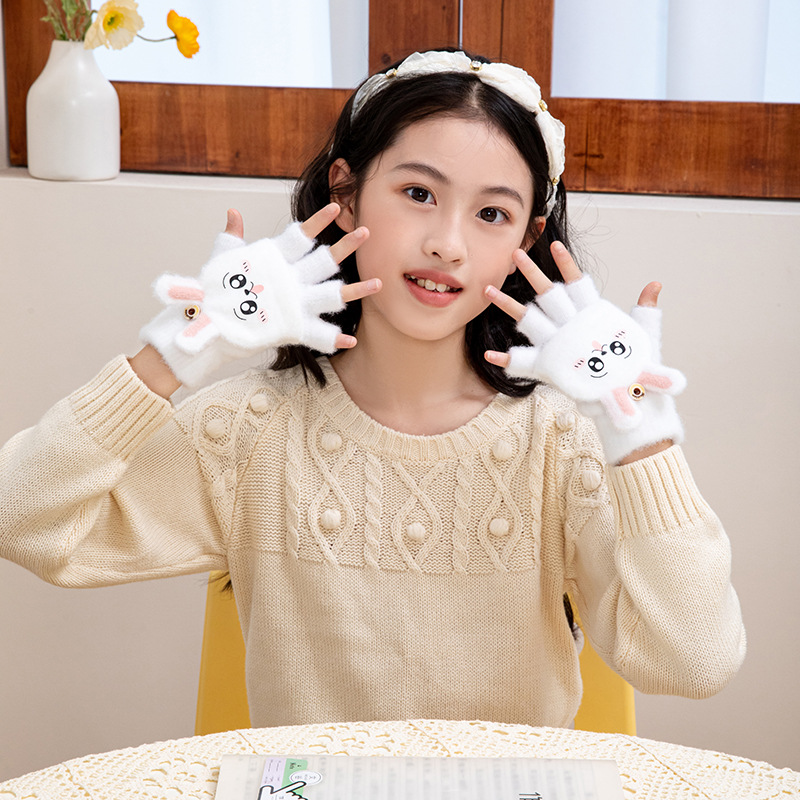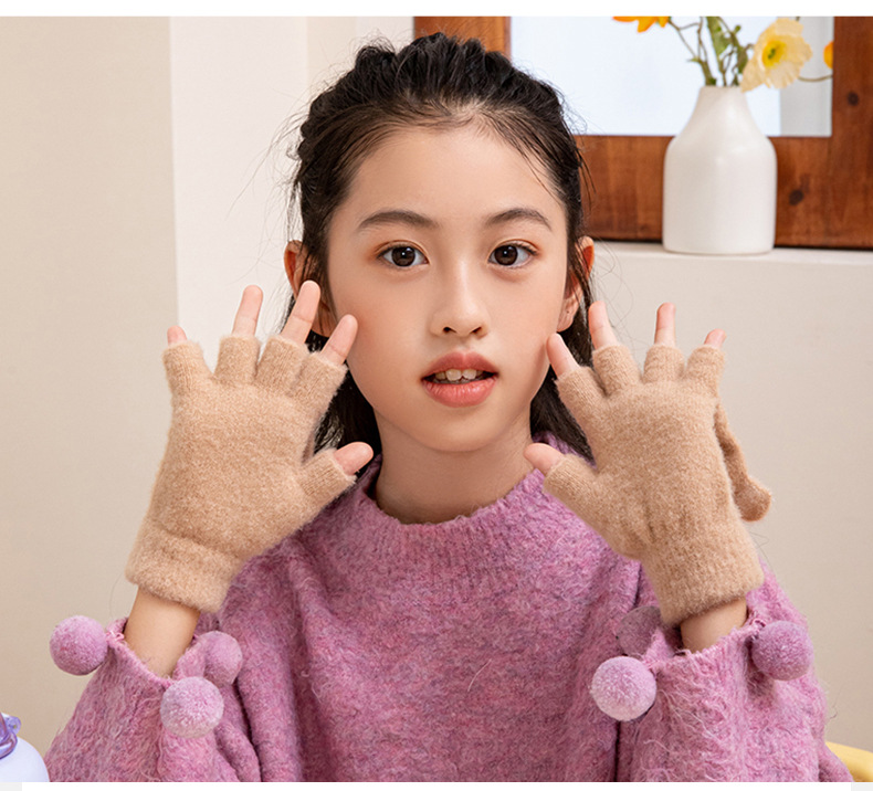 어린이 가을과 겨울 따뜻한 봉제 두꺼운 반 장갑 지카와 자카드 따뜻한 학생 하프 핑거 플립 커버 장갑