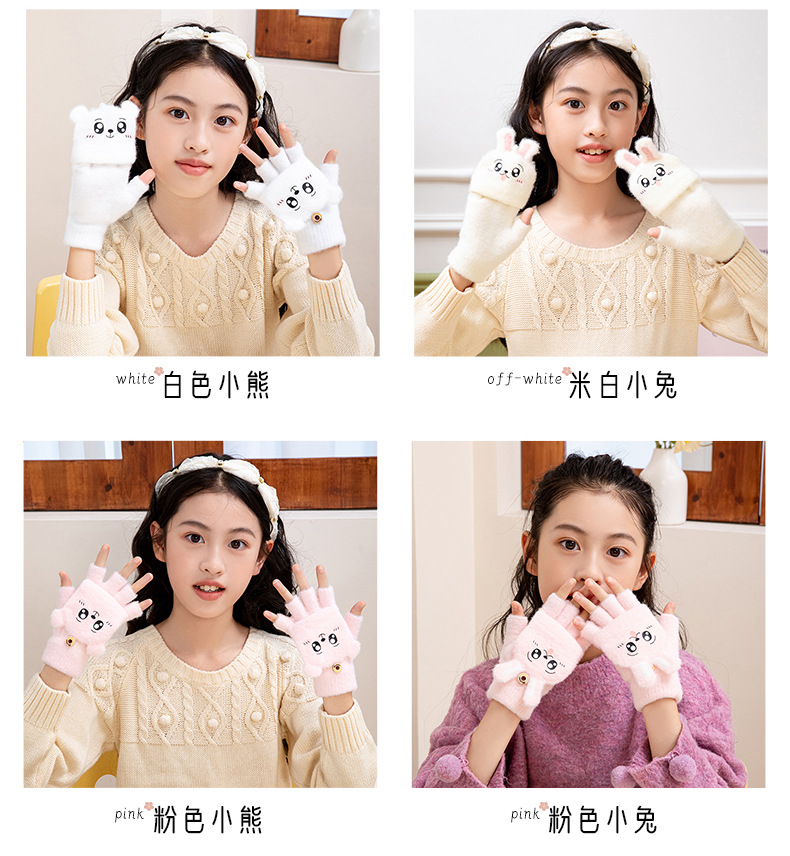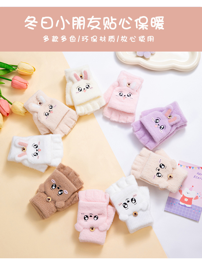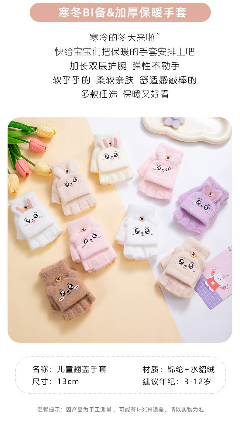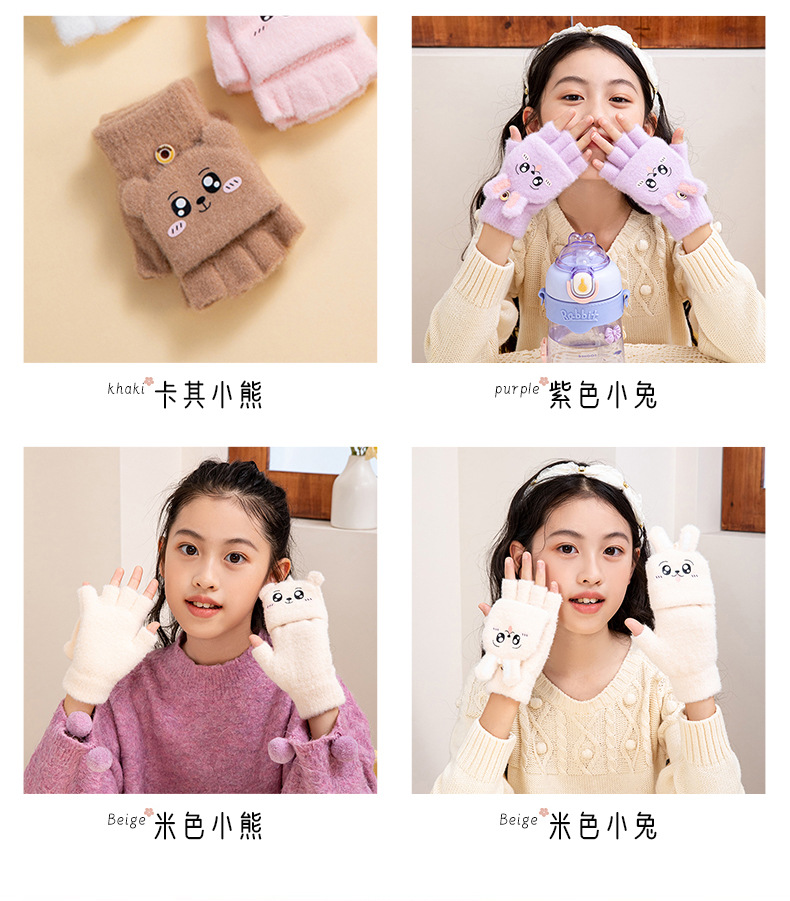 儿童保暖可爱毛绒半指翻盖手套。材质锦纶、水晶纱线材料