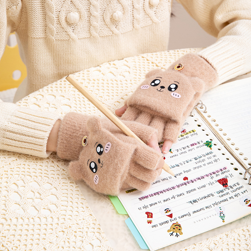 어린이 가을과 겨울 따뜻한 봉제 두꺼운 반 장갑 지카와 자카드 따뜻한 학생 하프 핑거 플립 커버 장갑스토어 가기