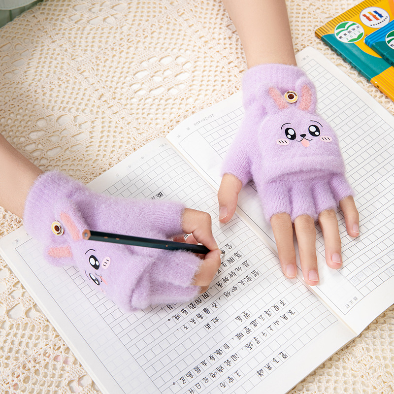 • 어린이 따뜻한 반 손가락 장갑 토끼 보라색